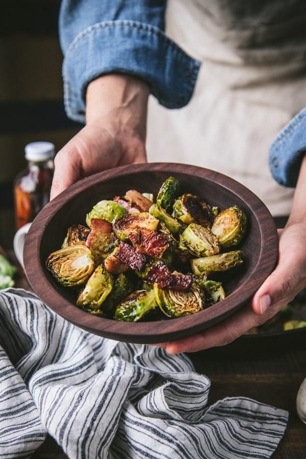 The best oven roasted Brussels sprouts are crispy and caramelized on the outside, tender on the inside, and tossed with smoky bacon. A drizzle of balsamic vinegar and a touch of maple syrup truly sets this dish apart from the rest! The flavorful veggies are delicious with roast chicken, salmon, pork and meatloaf on a busy weeknight, and fancy enough to serve alongside a Thanksgiving turkey or a Christmas ham!