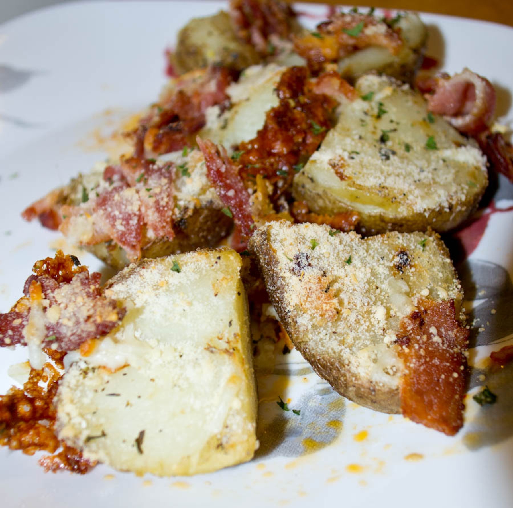 Oven roasted potatoes topped with bacon and parmesan- does it get better than that?