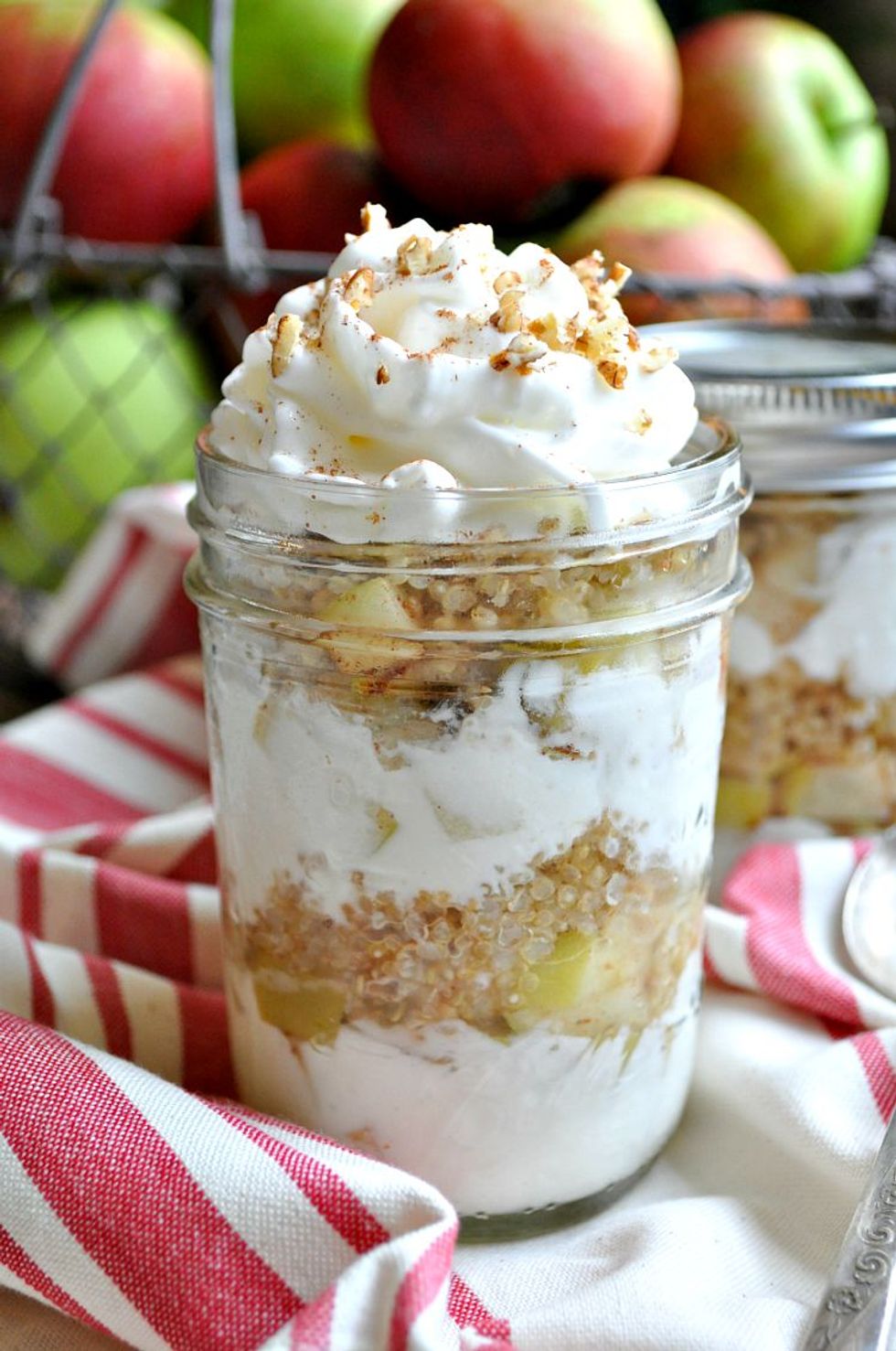 This easy grab-and-go breakfast is a fall treat for your tastebuds! Layers of tender spiced apples, creamy Greek yogurt, and protein-packed quinoa come together in a healthy Overnight Apple Crisp Breakfast Parfait that tastes like a decadent dessert!