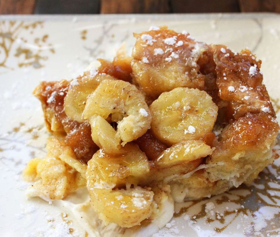 A layer of gooey sugar-y goodness tops sweet bananas and a cream-cheese stuffed French toast casserole in this overnight breakfast casserole.