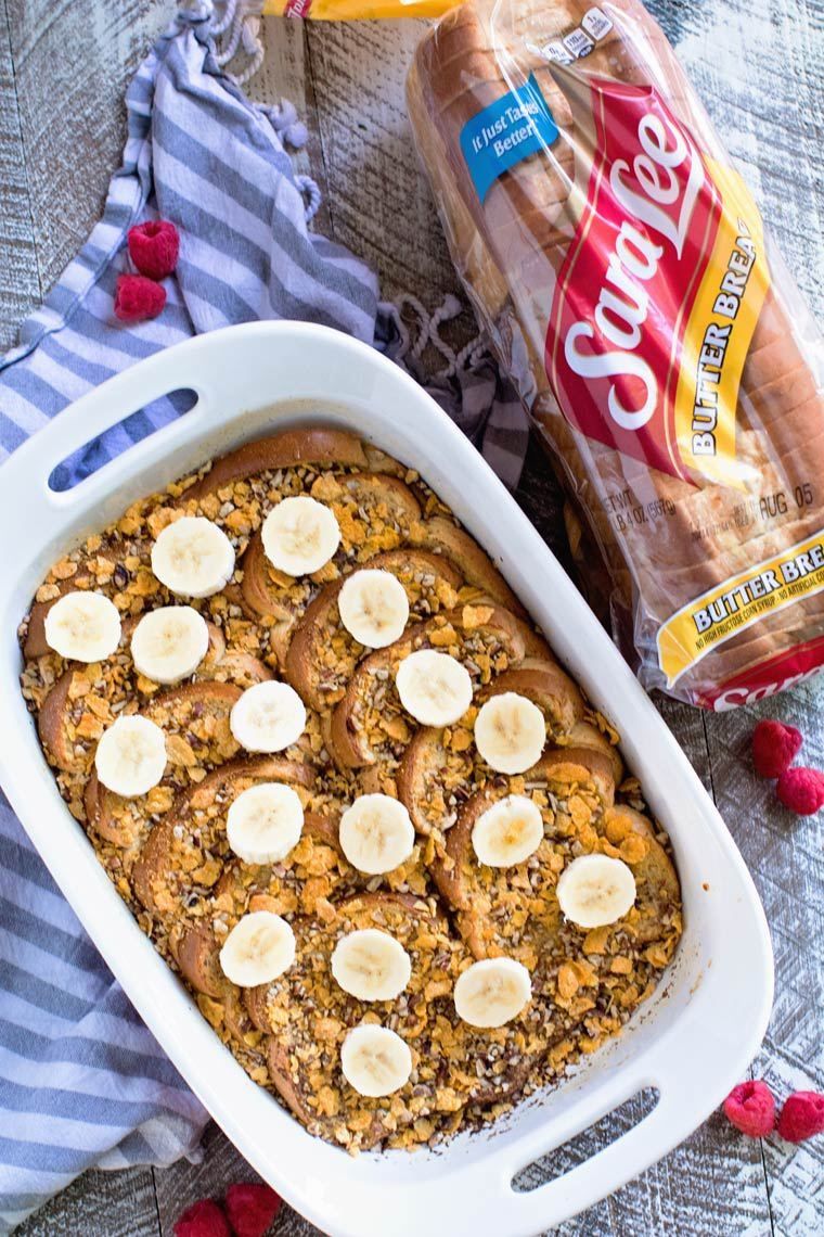 Delicious Overnight French Toast with a crunch from corn flakes and chopped pecans. We are loving the addition of bananas in this Overnight Pecan Banana French Toast for a quick and easy breakfast that is perfect for hosting company or a quick weekday breakfast!