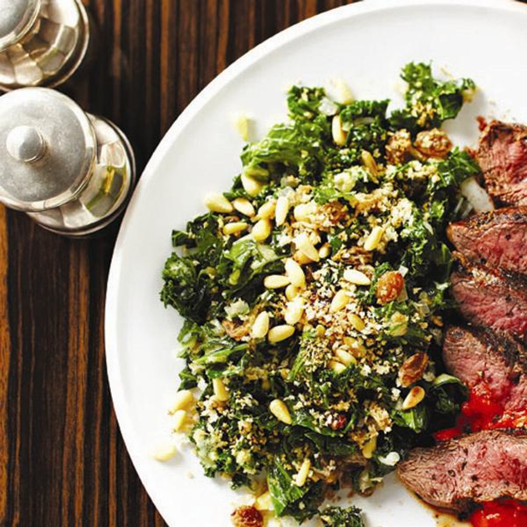 Heat a large frying pan over medium. Add pine nuts and panko. Toast, stirring often, until fragrant and golden, 3 to 5 min. Transfer to a small bowl. Add 1 tbsp oil to pan, then shallots. Cook until soft, about 2 min. Whisk remaining oil with lemon juice, Dijon and salt in a small bowl. Set aside. Add raisins and sherry, then kale to shallots. Cook until kale just starts to wilt, about 3 min. Add vinaigrette and stir just until coated, 1 min. Transfer to a platter and sprinkle with pine nut mixture. Serve with Ox and Angela’s grilled flatiron steak.