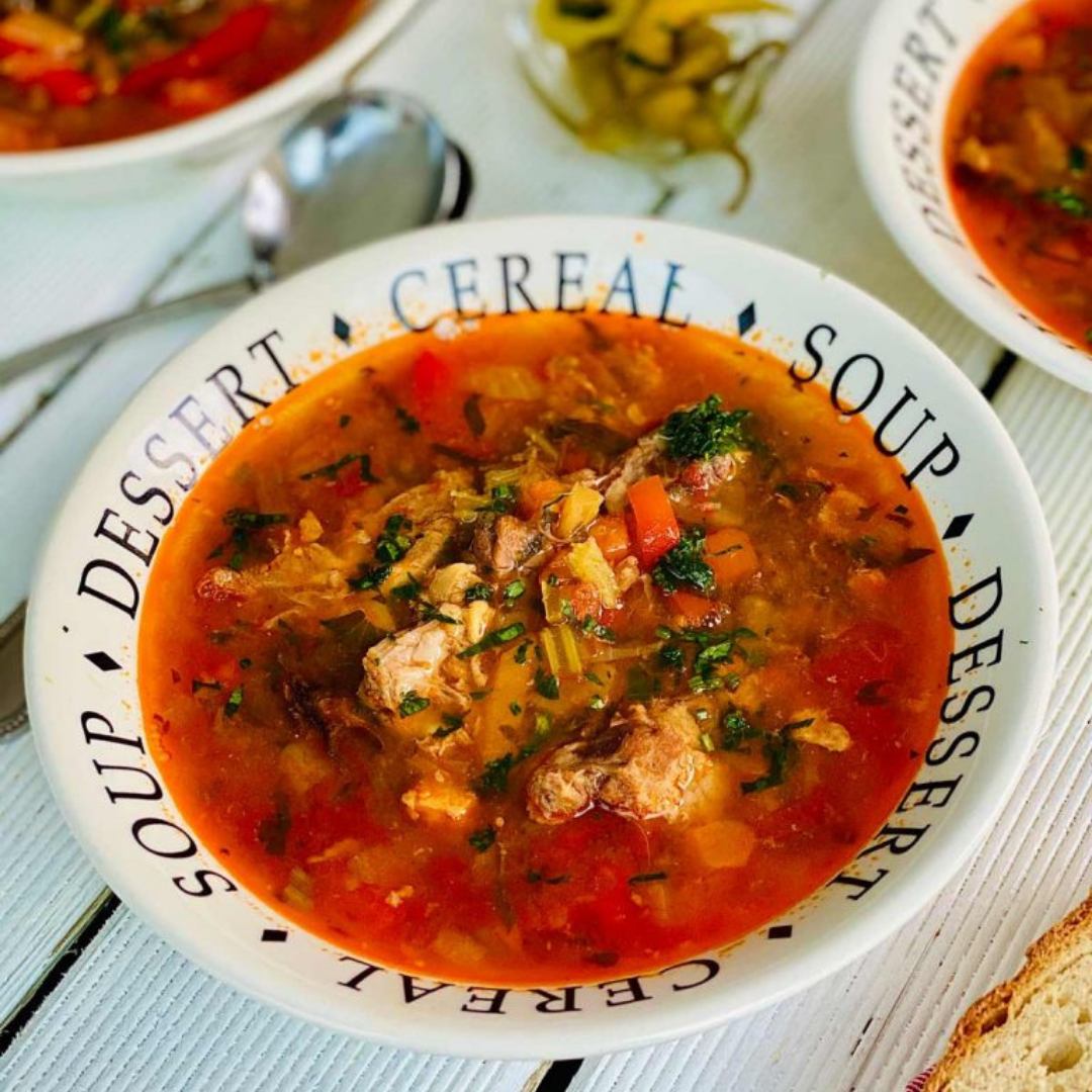 Oxtail and lamb neck soup with fresh lovage