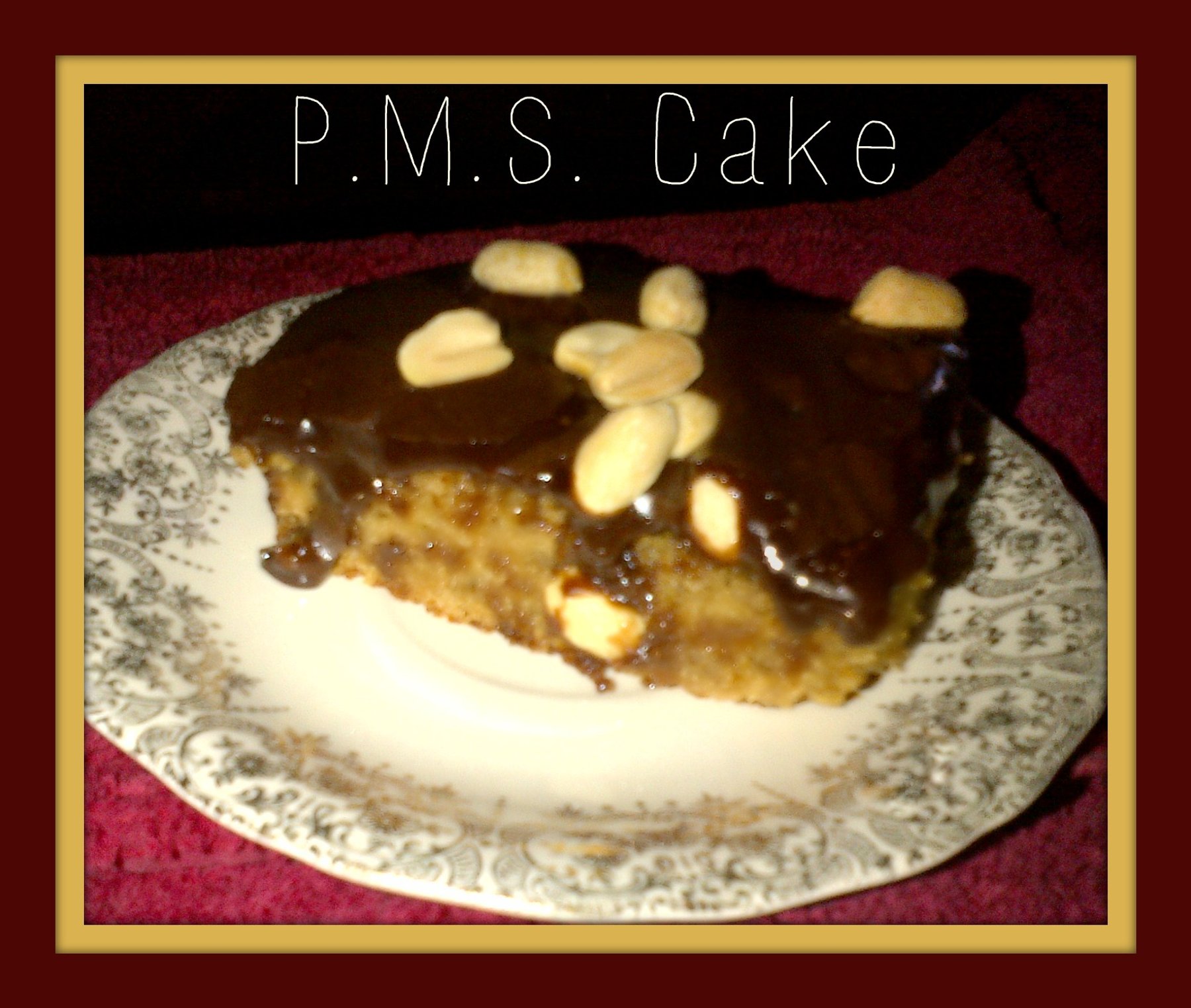 Here is is, the cure for P.M.S. Share it with your girlfriends. With this peanutty chocolaty cake, OH P.M.S. can be WONDERFUL!!!