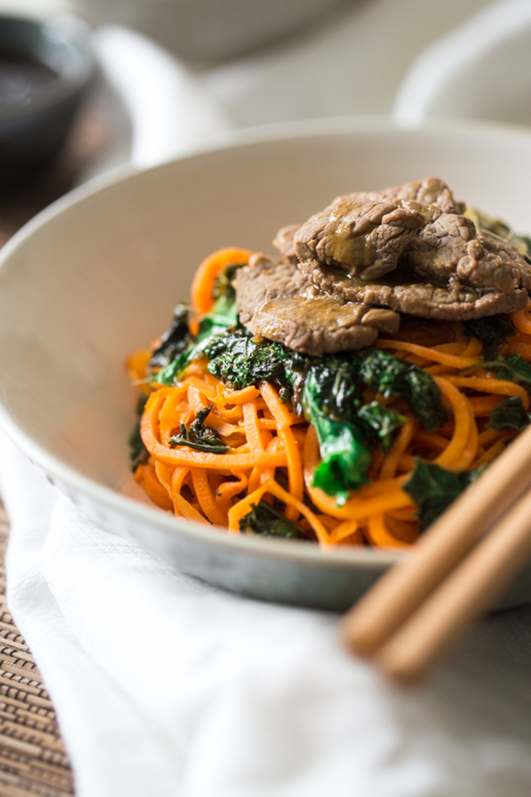 Paleo Kale Orange Beef Stir Fry with Spiralized Sweet Potato Noodles -
