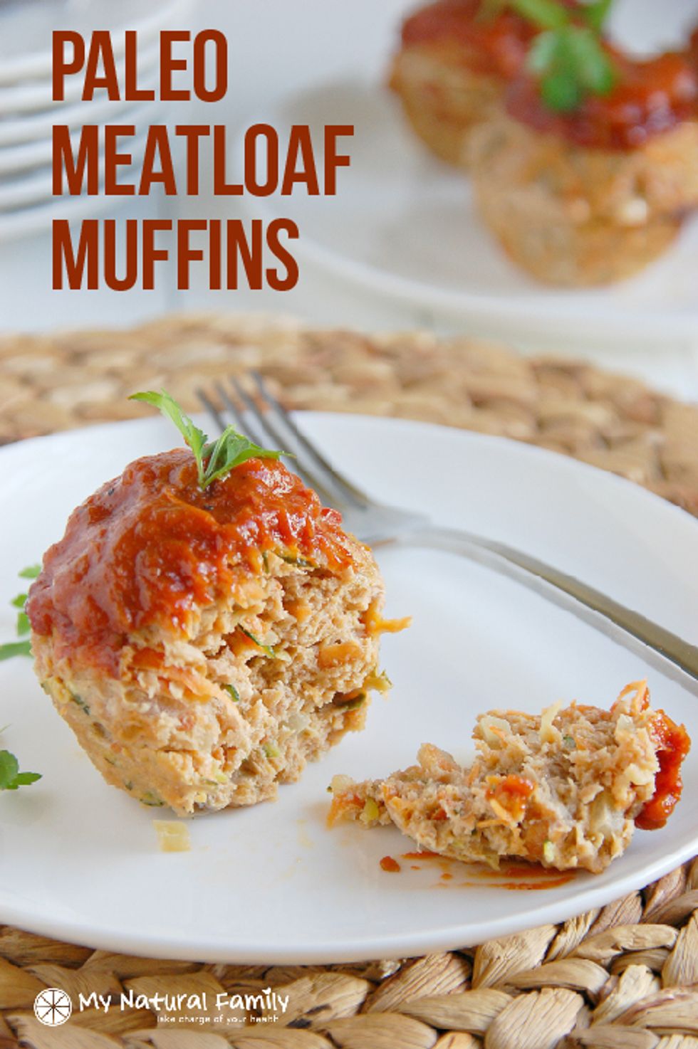 A vegetable-packed meatloaf muffin recipe, with ground turkey and ground pork. They are topped with a flavorful sugar-free tomato sauce.