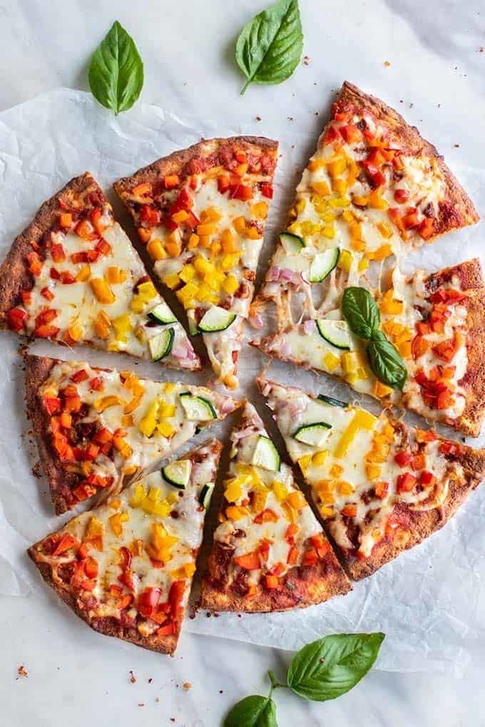 This healthy Paleo Pizza Crust is made from whole foods, and in my opinion, is better than a regular wheat crust! Although this crust calls for yeast, the process of making it is much simpler than a wheat dough, and it bakes into a chewy crust with a crispy bottom – sturdy enough for all your favorite pizza toppings!