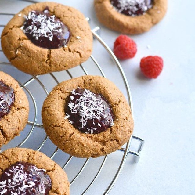 Paleo Raspberry Coconut Thumbprint Cookies! No one will guess these easy to bake coconut and nut butter cookies made with raspberry chia jam are grain free! Paleo + Gluten Free + Low Calorie