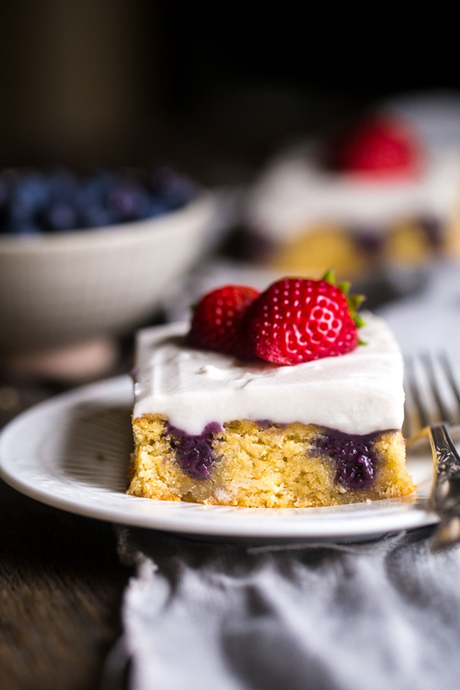 This paleo poke cake has sweet pockets of homemade blueberry filling and is topped with whipped coconut cream and strawberries for an easy, healthier dessert!