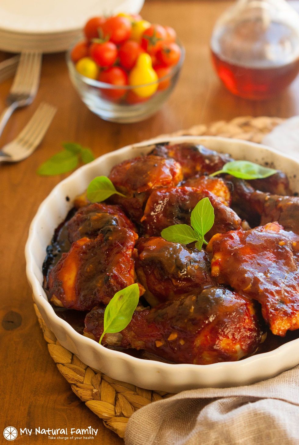 This is a Paleo chicken recipe. It is chicken with a sweet and sticky BBQ sauce on top.