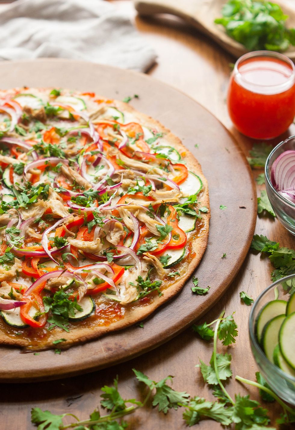 This pizza has a bold flavor and features fresh, crisp vegetables and bright colors. I made a Paleo “cheese” by blending together coconut milk and an egg yolk…it binds all the ingredients together and keeps the toppings from falling off of the pizza without any sort of “eggy” taste.