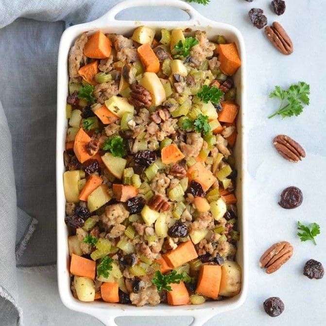 Paleo Thanksgiving Stuffing made grain free with a healthy twist. This holiday dish has the flavor of traditional stuffing without the grains. Easy to make and crowd pleasing! Paleo + Gluten Free + Low Calorie
