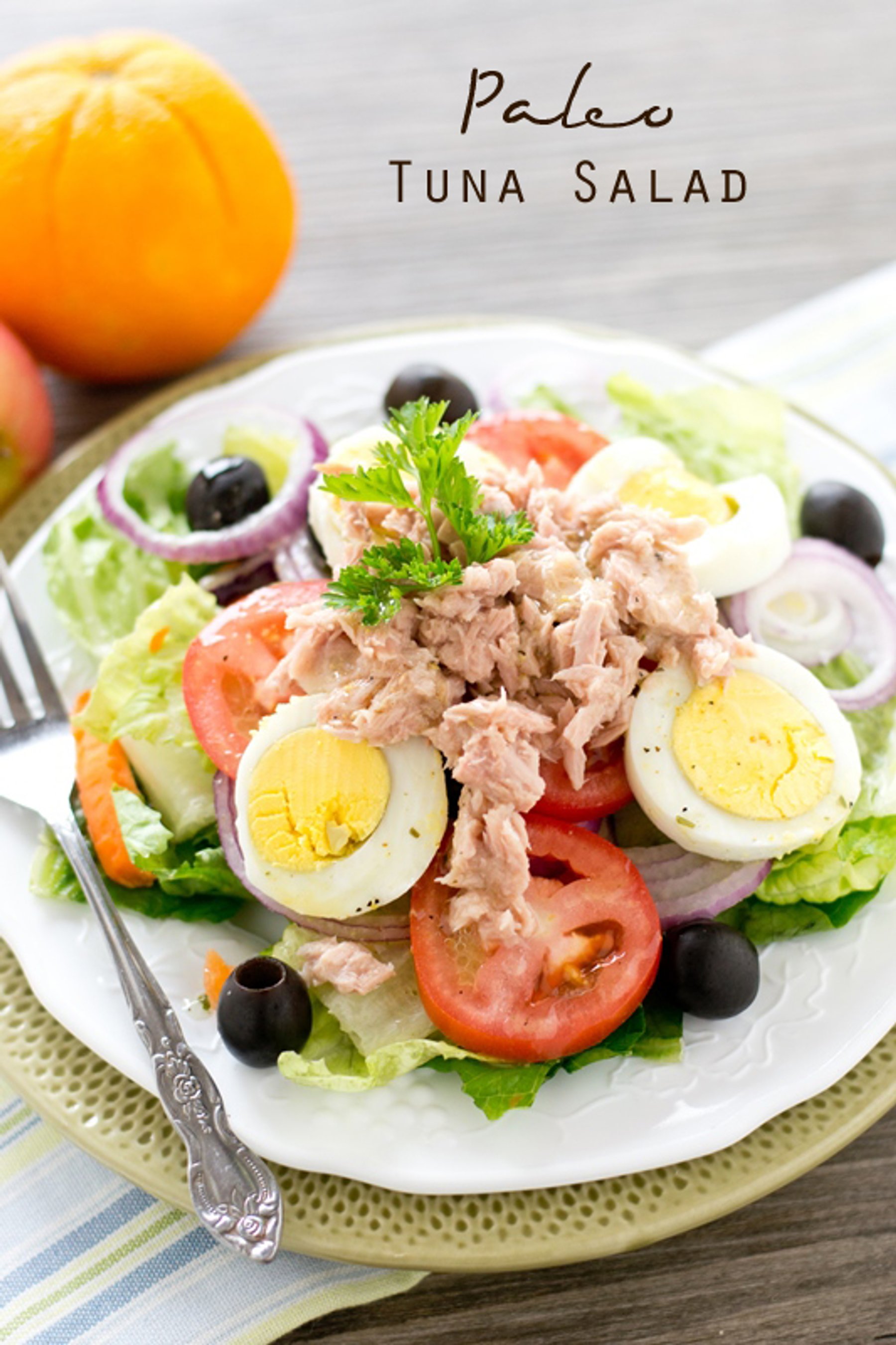 Paleo Tuna Salad is packed with protein, vegetables, olives and drizzled with a homemade dressing.