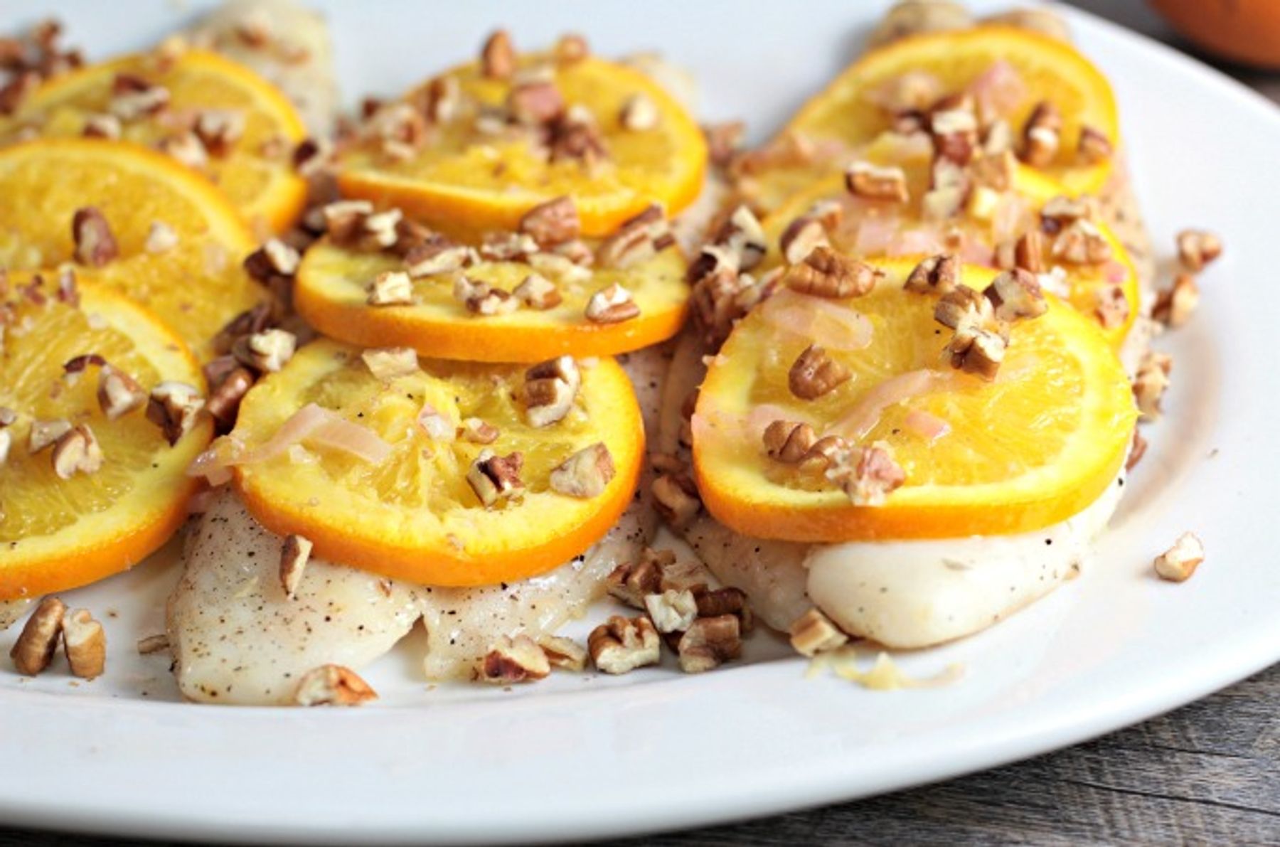 Pan Fried Fish with Oranges and Pecans features white fish, shallots, white wine vinegar, orange juice, and butter. A quick, easy, and healthy dish.