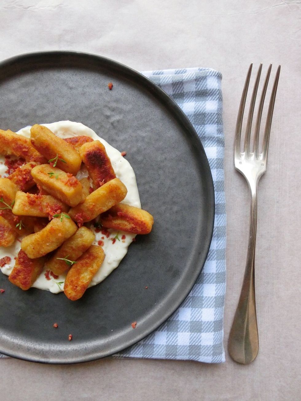Pan-Fried Plantain Gnocchi with Crème Fraiche and Bacon Crumbs