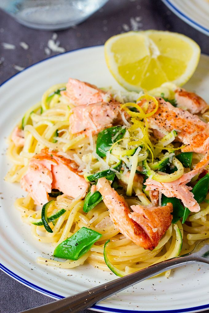 A fantastic pasta recipe that's on the table in under 20 minutes. My Pan Fried Salmon is flaked into tender pieces and served with spaghetti & zoodles/courgetti in a light lemon cream sauce.