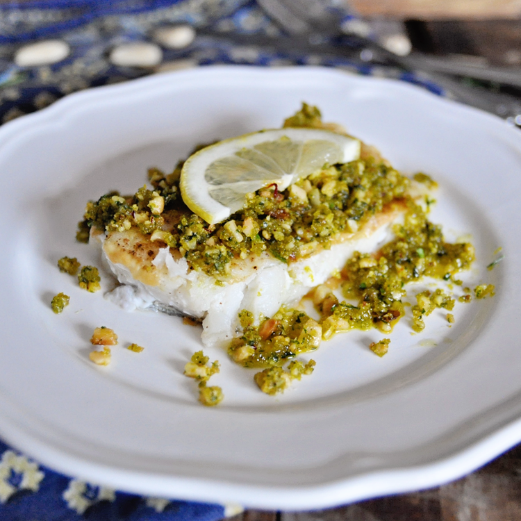 Pan Grilled Spanish Cod with Almond Picada Sauce