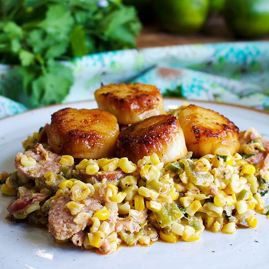 In about 30 minutes, you could be eating a plate full of roasted sweet corn and chorizo sausage that's been cooked in a creamy mixture of green chilies, scallions, garlic and jalapeños and topped with tender scallops gorgeously seared in chorizo oil.