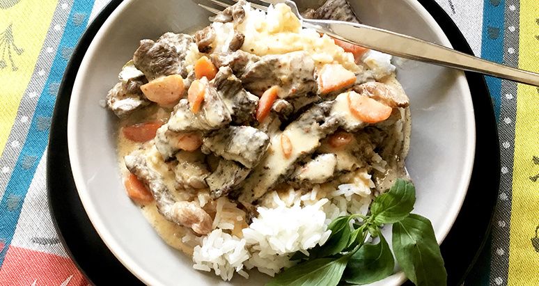 This delicious Panang curry features tender, well-marbled Fullblood Wagyu ribeye steak. The slightly sweet yet savory curry is draped over jasmine rice and garnished with torn Thai basil leaves! The recipe highlights the kaleidoscope of flavors found in Southern Thai cuisine!