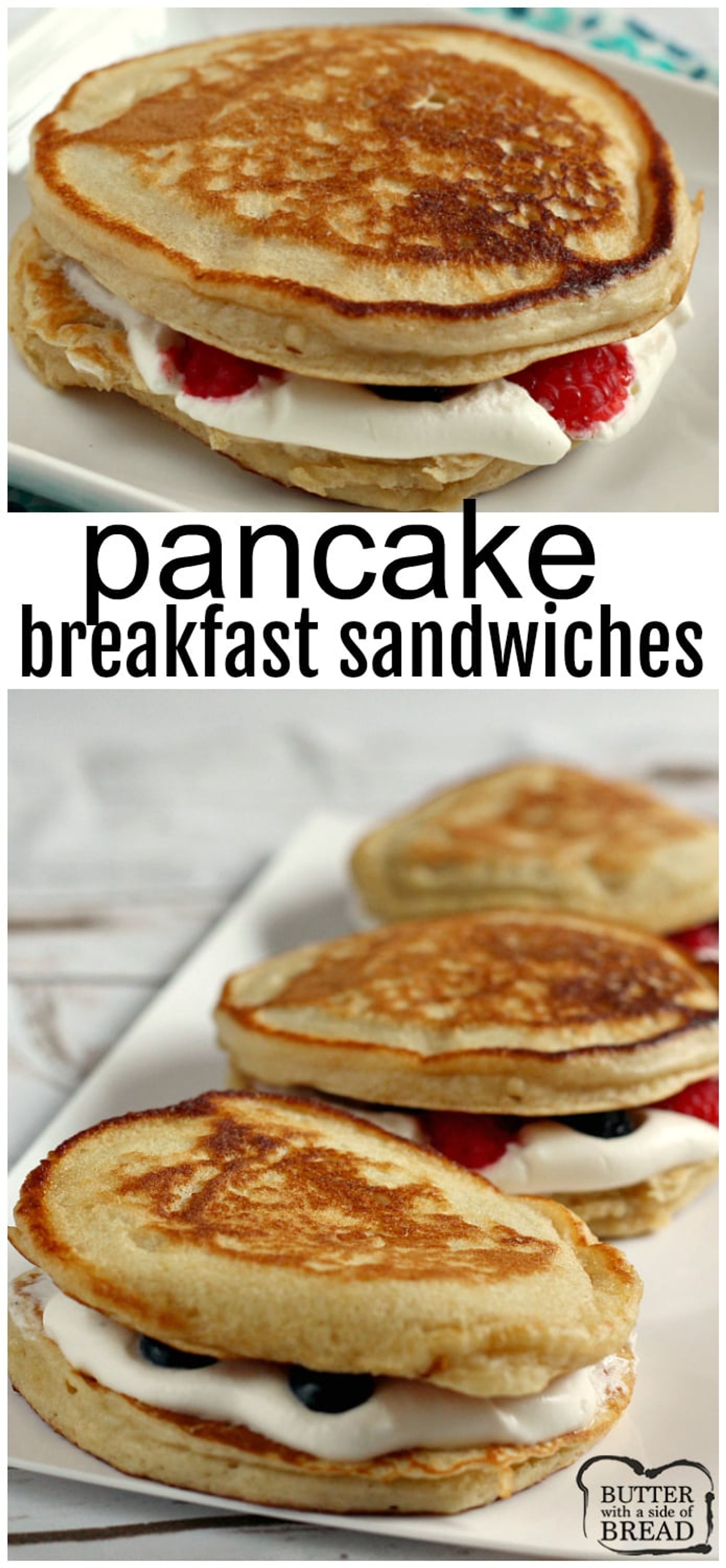 Pancake Breakfast Sandwiches are made with buttermilk pancakes, a delicious maple whipped cream filling and your favorite fresh fruit!