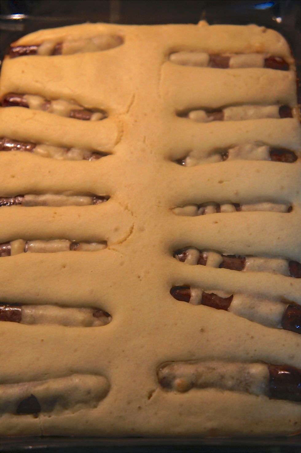 Brown sausage until almost cooked through. Place sausage in prepared baking dish in two rows of eight.