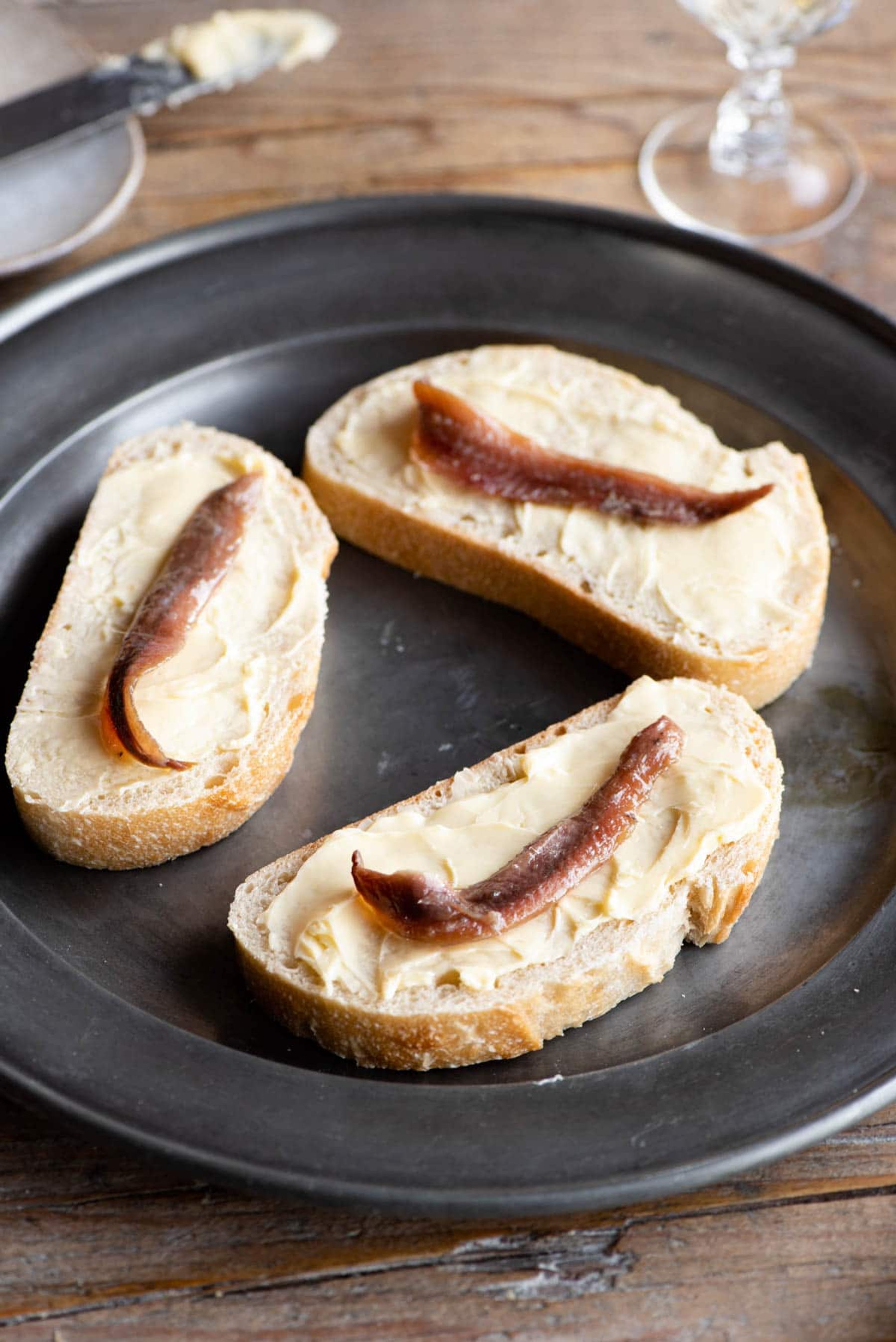 Thick slices of white crusty bread, slathered with butter and topped with salted anchovies. The simplest authentic antipasto!