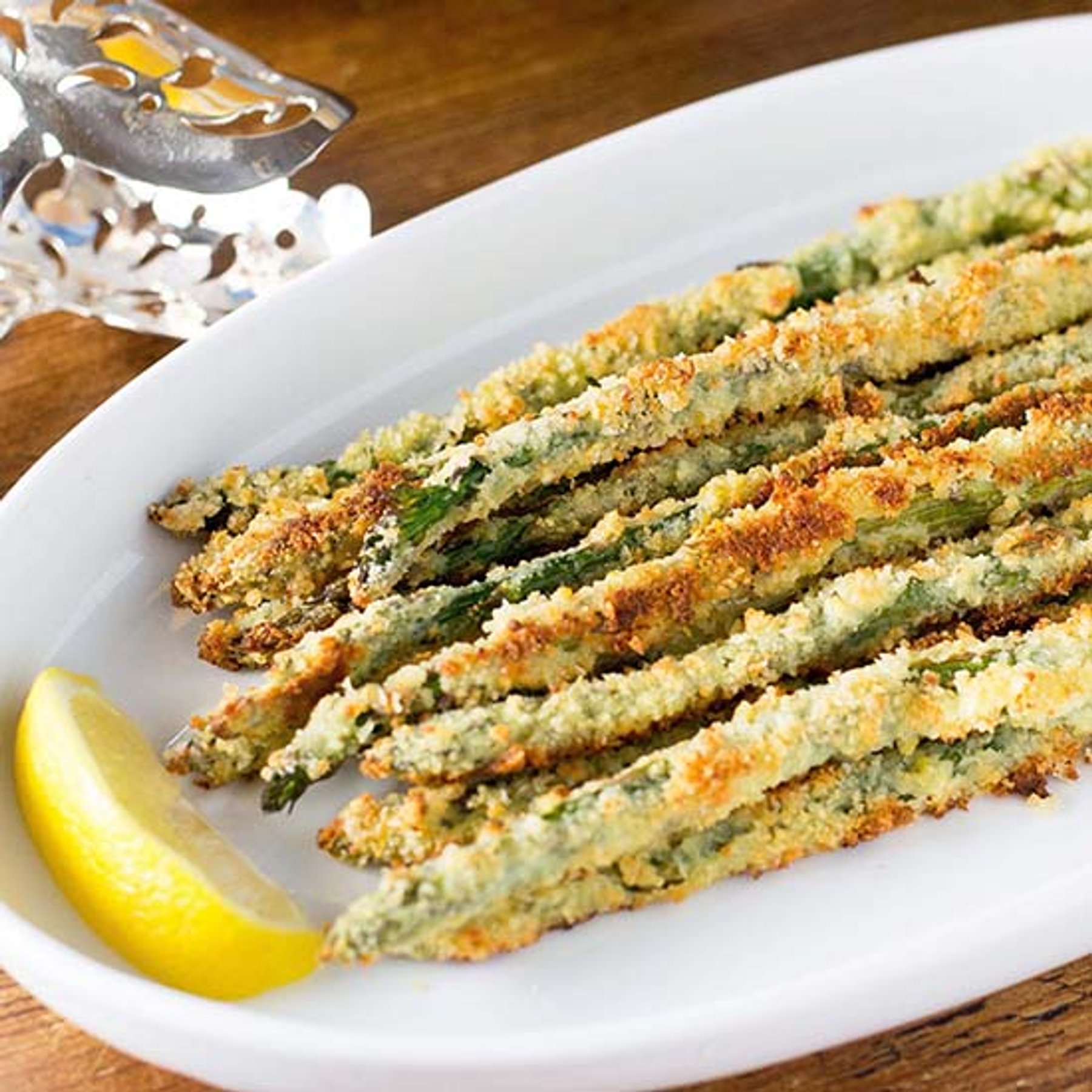 Panko Parmesan Crusted Asparagus - Asparagus is encased in a crispy coating of panko-parmesan crumbs resulting is a vegetable that tastes more like a treat.