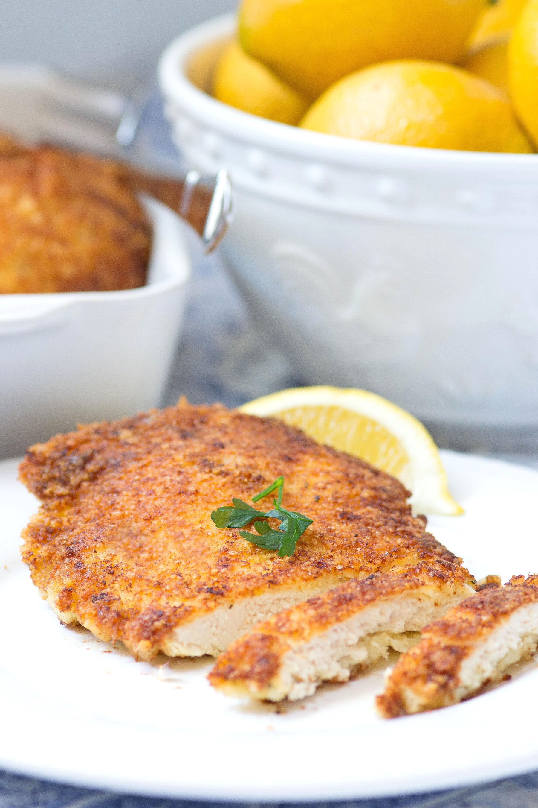 Best Lemon Chicken Ever! Panko Parmesan Crusted Lemon Chicken is crispy, lemony, juicy and delicious. Use it to make chicken parm or chicken ceasar salad too. This dish is a real crowd pleaser!