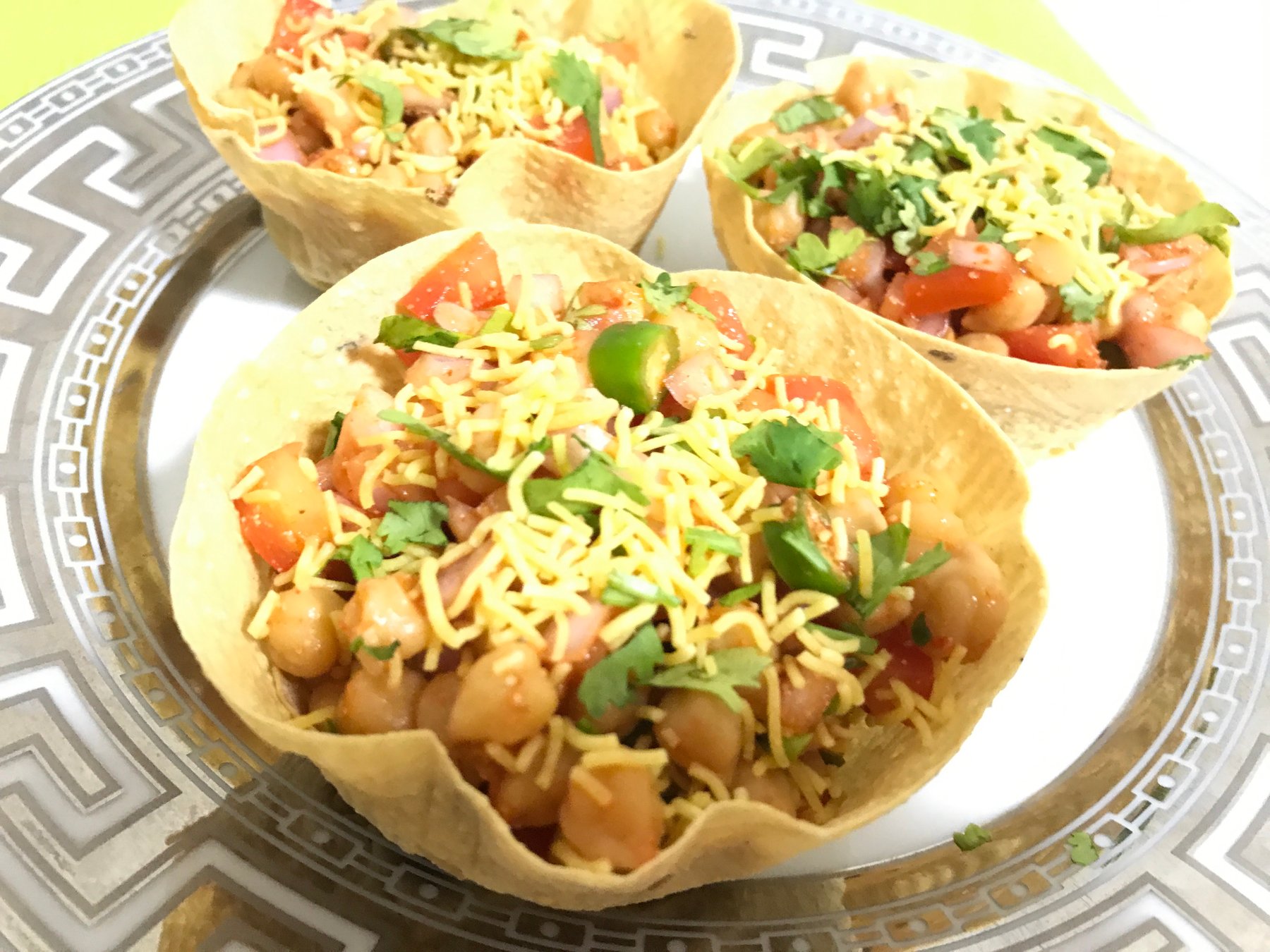 A healthy crispy papad katori's chana chaat filled with rich protein chickpeas and spices.