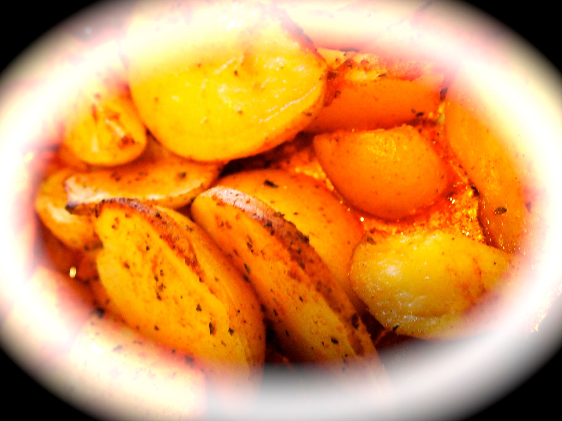 Mix the spices and the olive oil together. Cut the potatoes into wedges. Coat the potatoes well with the spice mix.