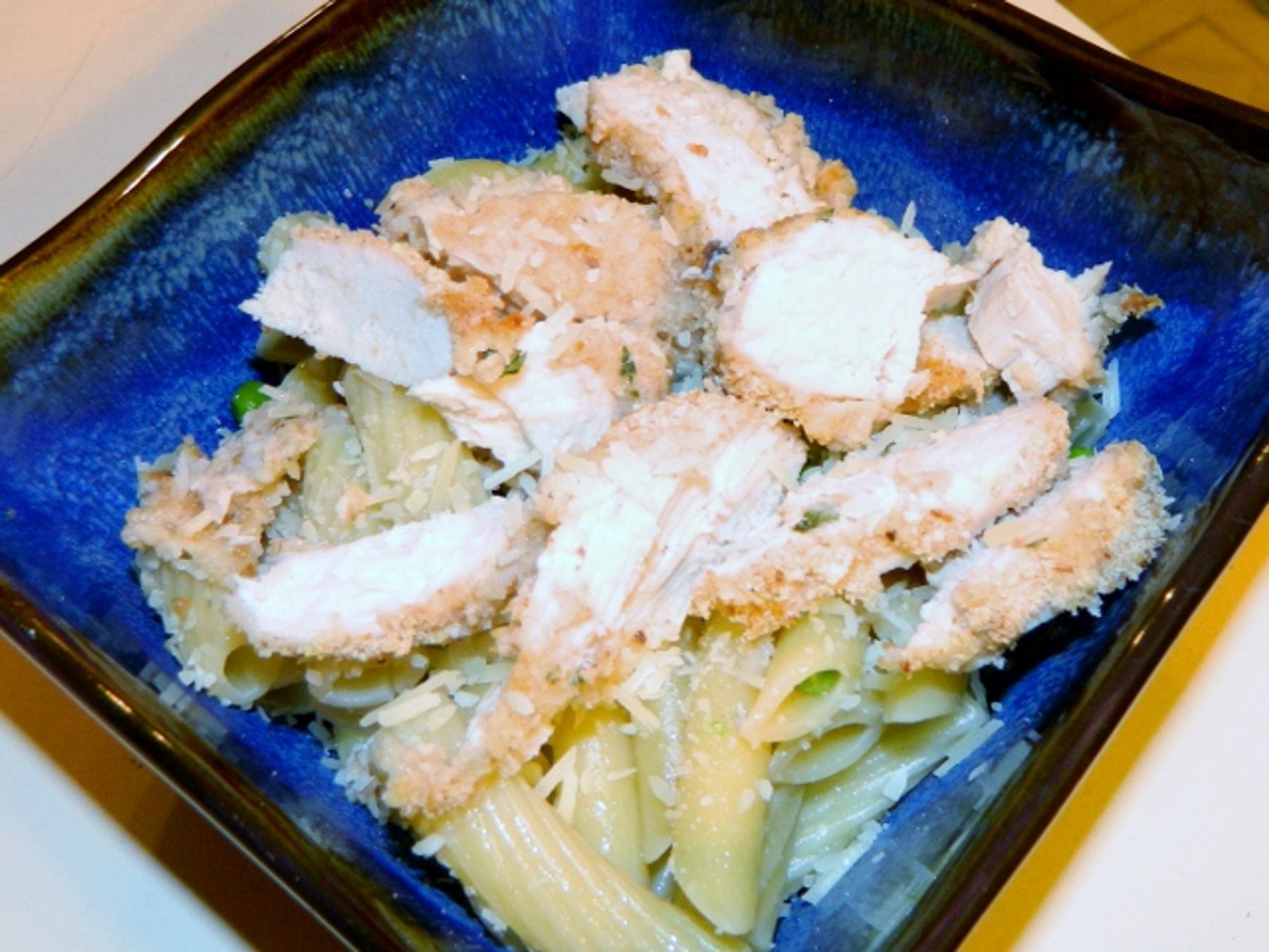 A light pasta served mixed with veggies and topped with juicy baked chicken.