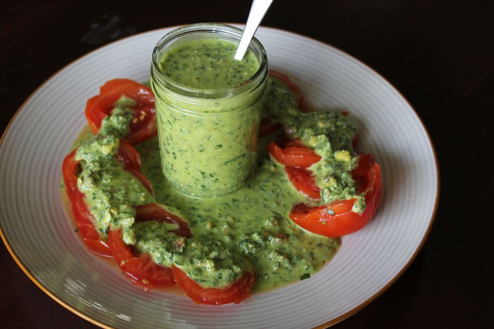 Traditional pesto is made with basil and pine nuts. Yumology's latest and greatest kitchen conquest is a pesto made with fresh parsley, pistachio nuts and a refreshing splash of Chardonnay. The exotic yet familiar flavors that are embodied in our pesto creation are a grand accompaniment to a variety of dishes: poultry, fish, meats, eggs, even hearty vegetables. Upon completing the recipe in our test kitchen we rewarded ourselves with a lunch of fresh sliced tomatoes smothered in a healthy