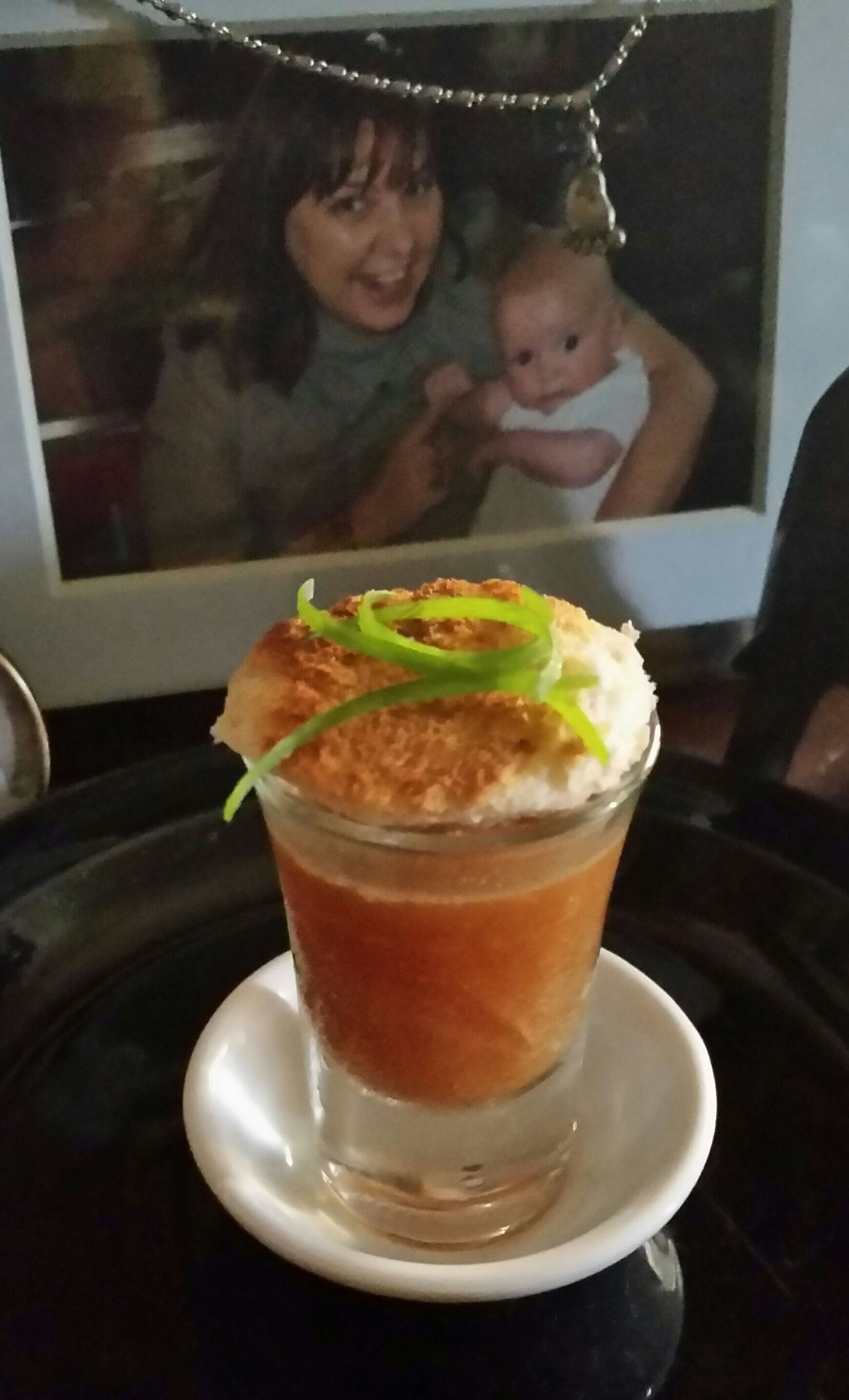 To assemble just ladle a the broth into the shot glasses top with the Parmesan croutons and a few chive sprigs on top. Serve warm.