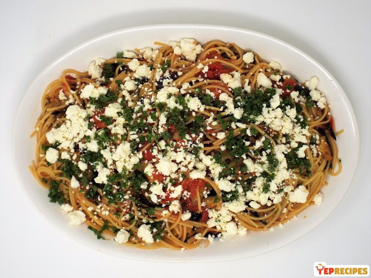 A Sicilian pasta dish made with fried eggplant, fresh tomatoes, and cheese.