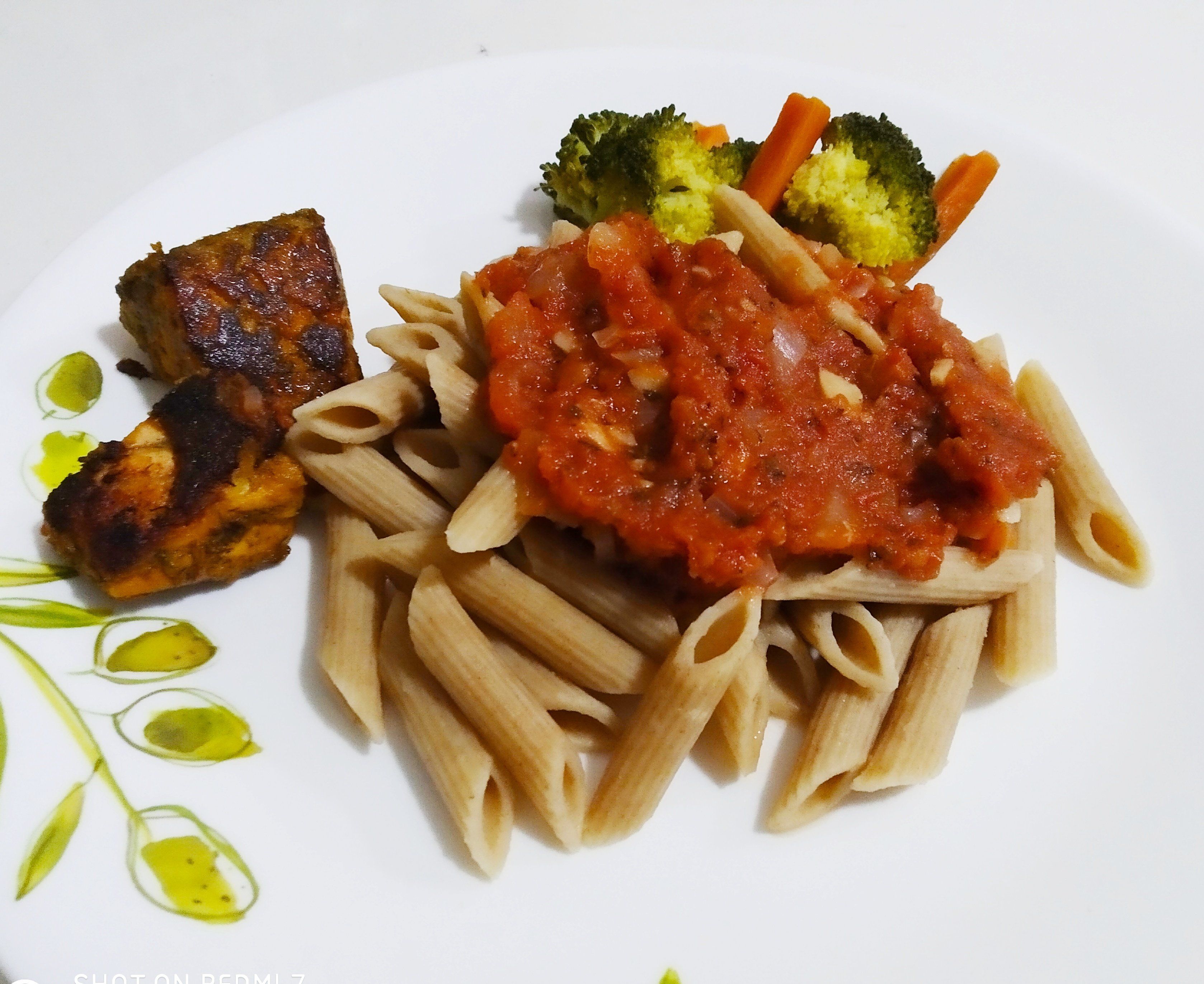 A pasta arrabiata recipe made using homemade arrabiata sauce and penne.Served along with broccoli stir fry and Dill weed salmon.