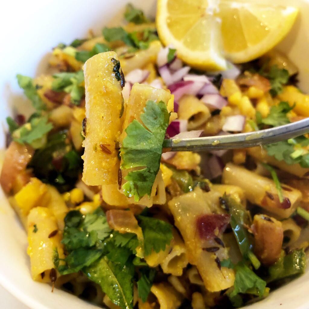 A warm dish which can be made for breakfast, brunch, or even a snack. It has both spice and a zesty tang that can be satisfying on many levels. In addition, the chewy pasta adds a perfect touch!