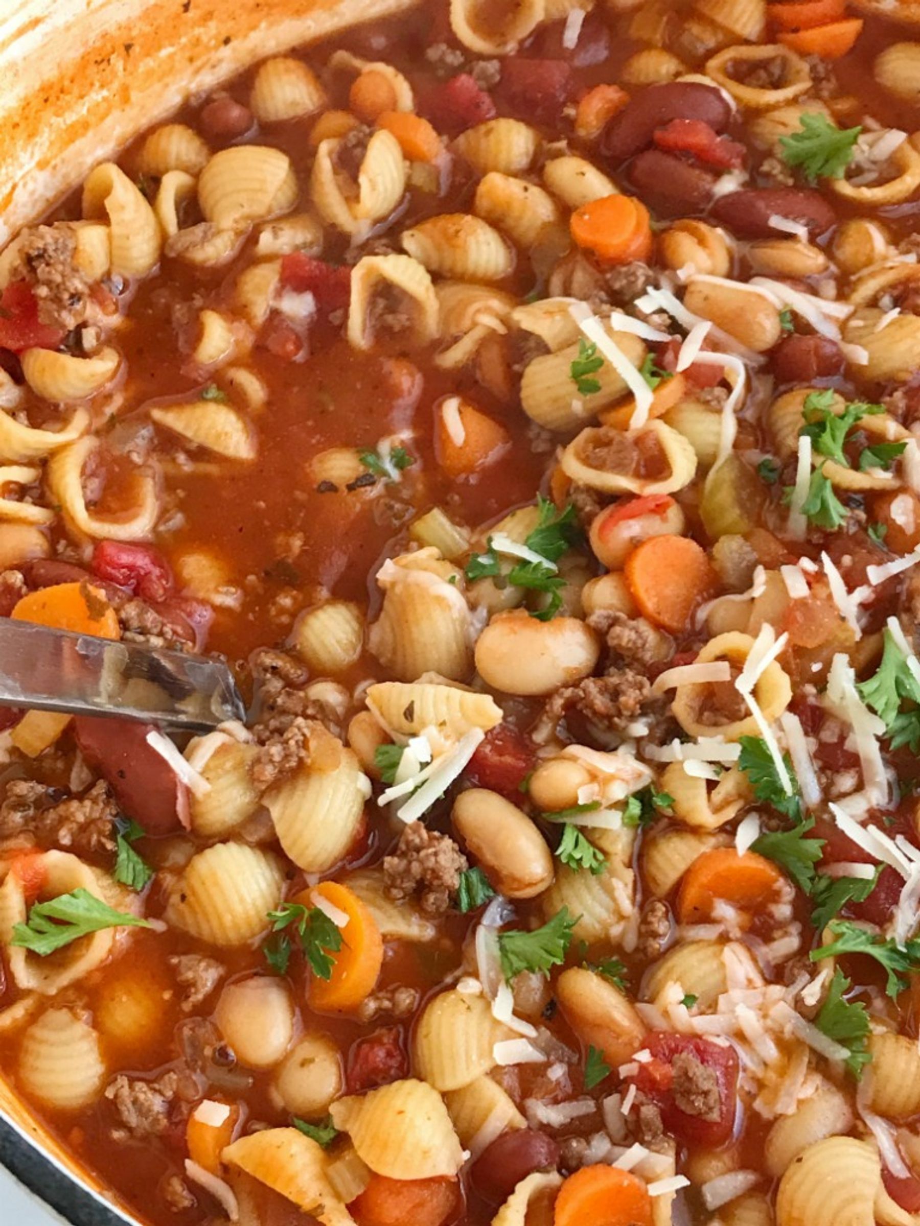 The best pasta fagioli soup! Canned spaghetti sauce and beef broth loaded with ground beef, vegetables, beans, tomatoes, and tender pasta.