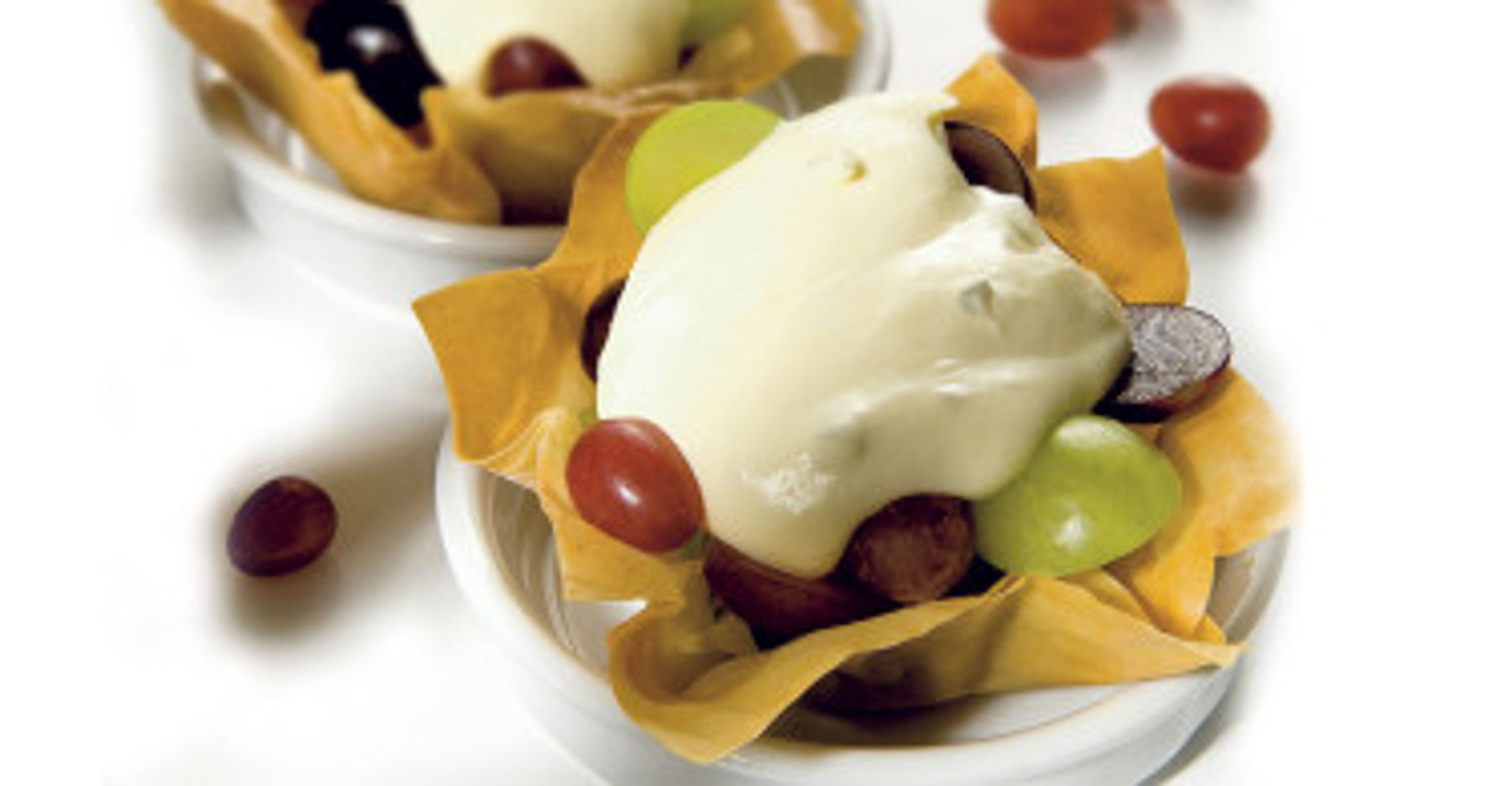 Shape phillo pastry in squares and place them on upside-down pastry paper cases. Brush with melted butter and sprinkle with icing sugar. Bake at 200° for several minutes while rinsing and cleaning grapes...