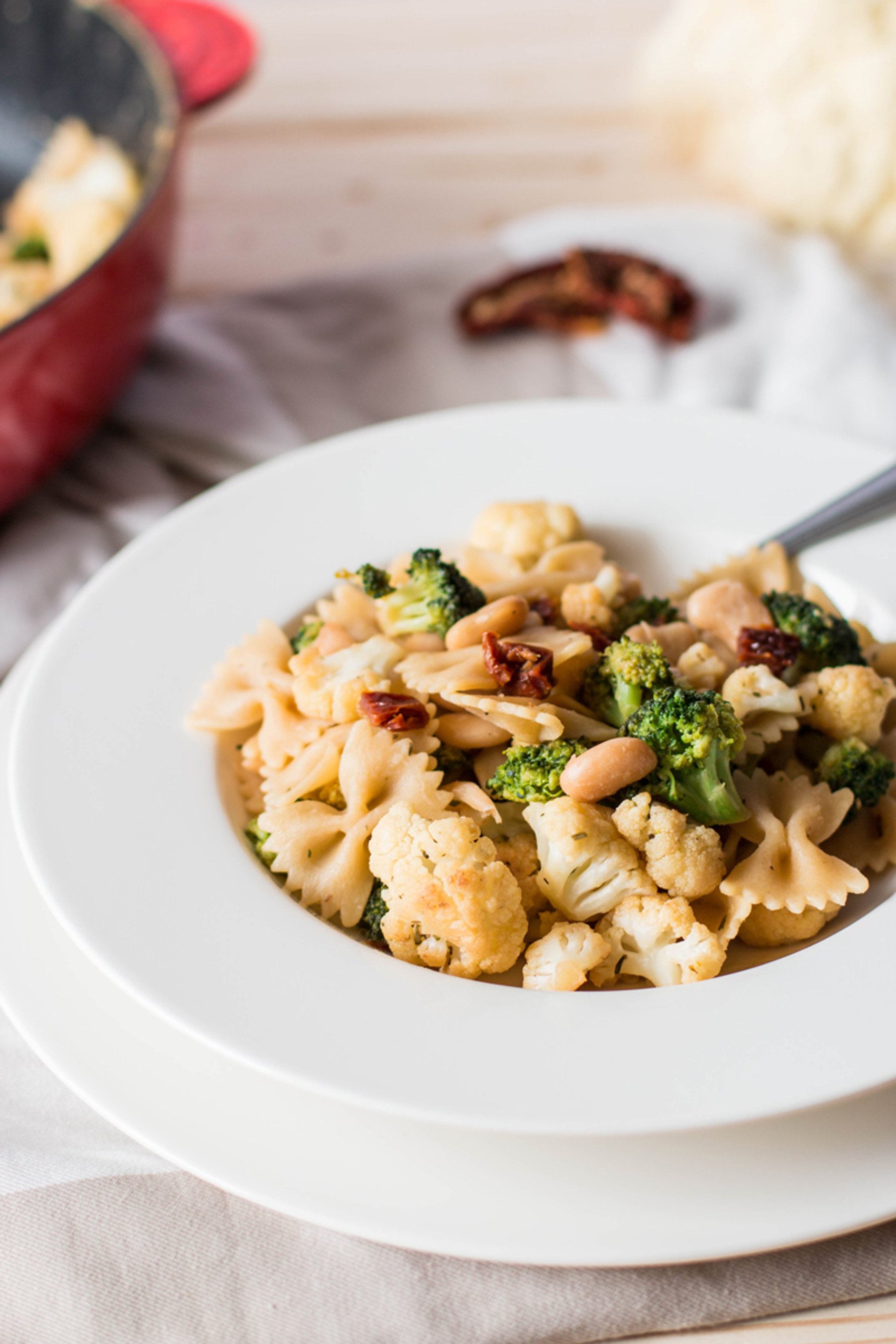 Wholegrain pasta mingles with roasted broccoli and cauliflower, subtly flavored by sun dried tomatoes and providing lots of wholesome plant-based protein from white beans!