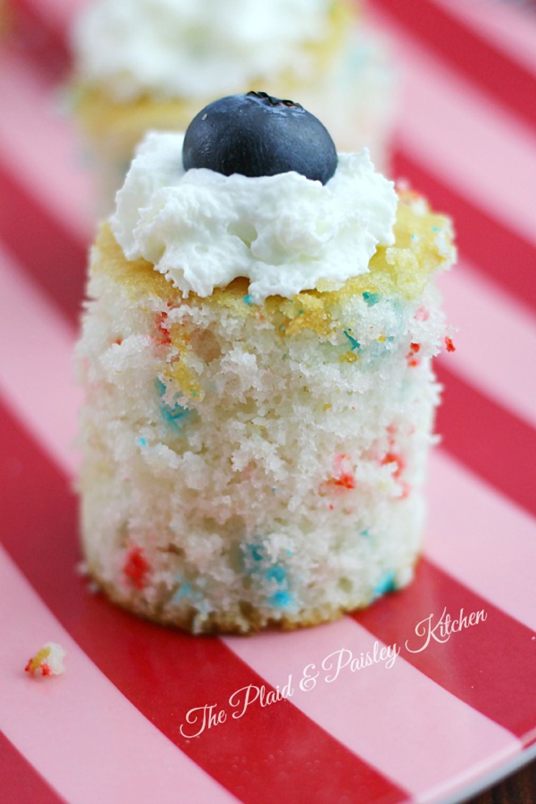 Patriotic Cake Bites ~ The Plaid & Paisley Kitchen ~ Celebrate the 4th with adorable and easy cake bites! Fill up on all the great hot dogs and burgers, you don\\\'t need much room left in your belly for these sweet mini treats.