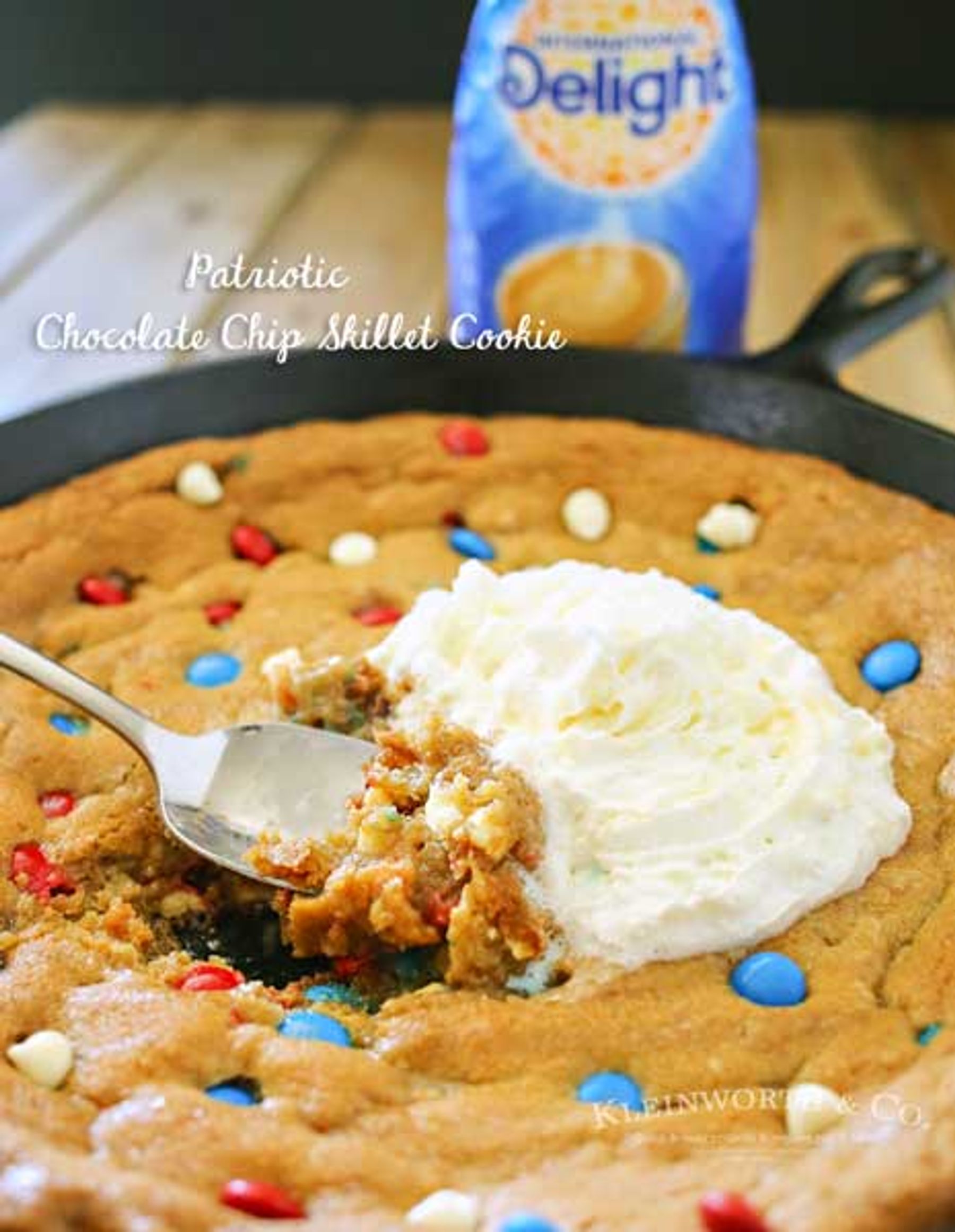 Patriotic Chocolate Chip Skillet Cookie is much like a Pizookie. A giant, thick & chewy chocolate chip cookie baked in an iron skillet with patriotic M&M’s.