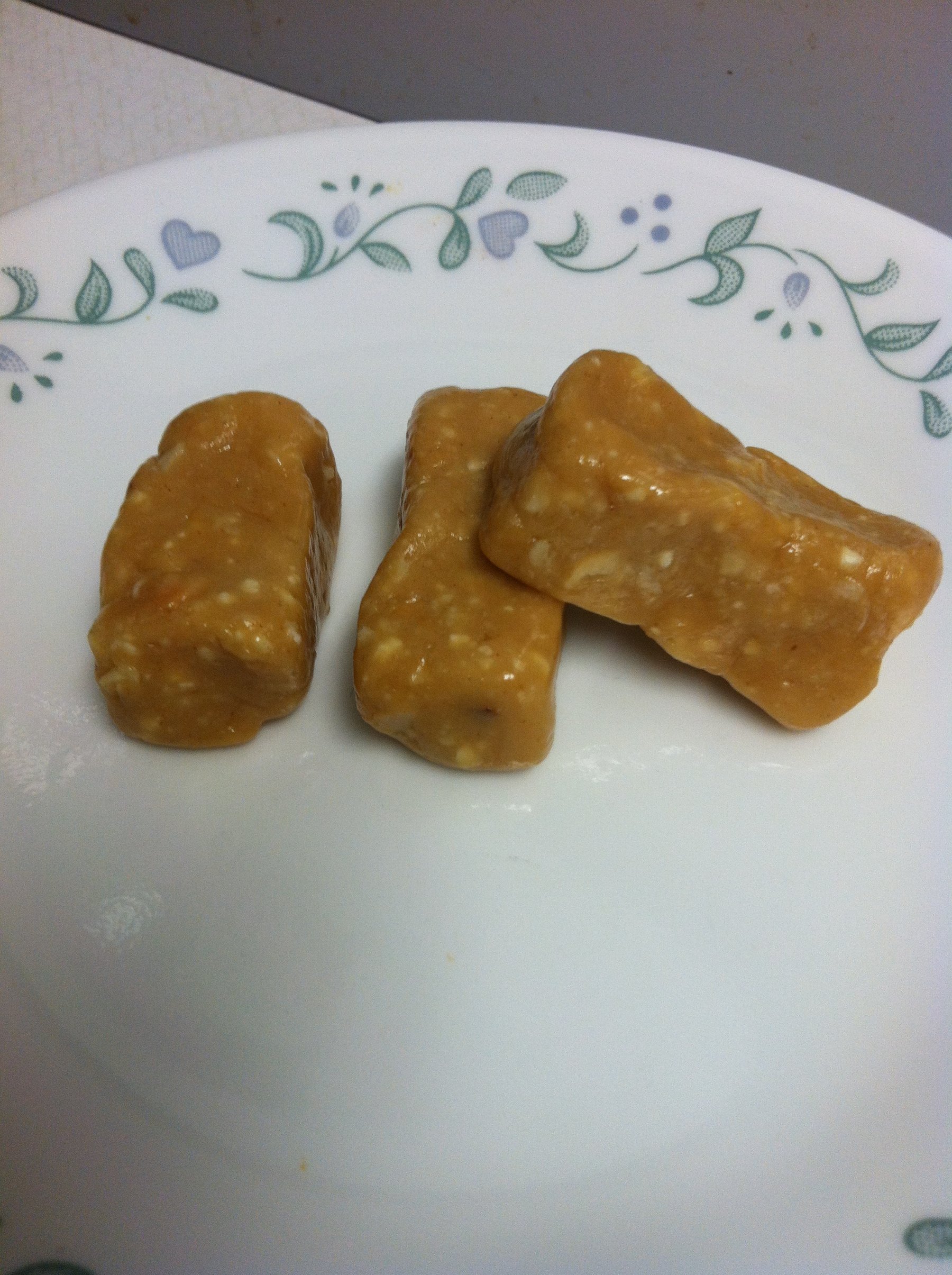 I found a peanut raisin log recipe in a vintage cook book. I did a slight change to the recipe by by removing the raisins and adding chopping peanuts instead. It tastes almost like a Pay Day bar.