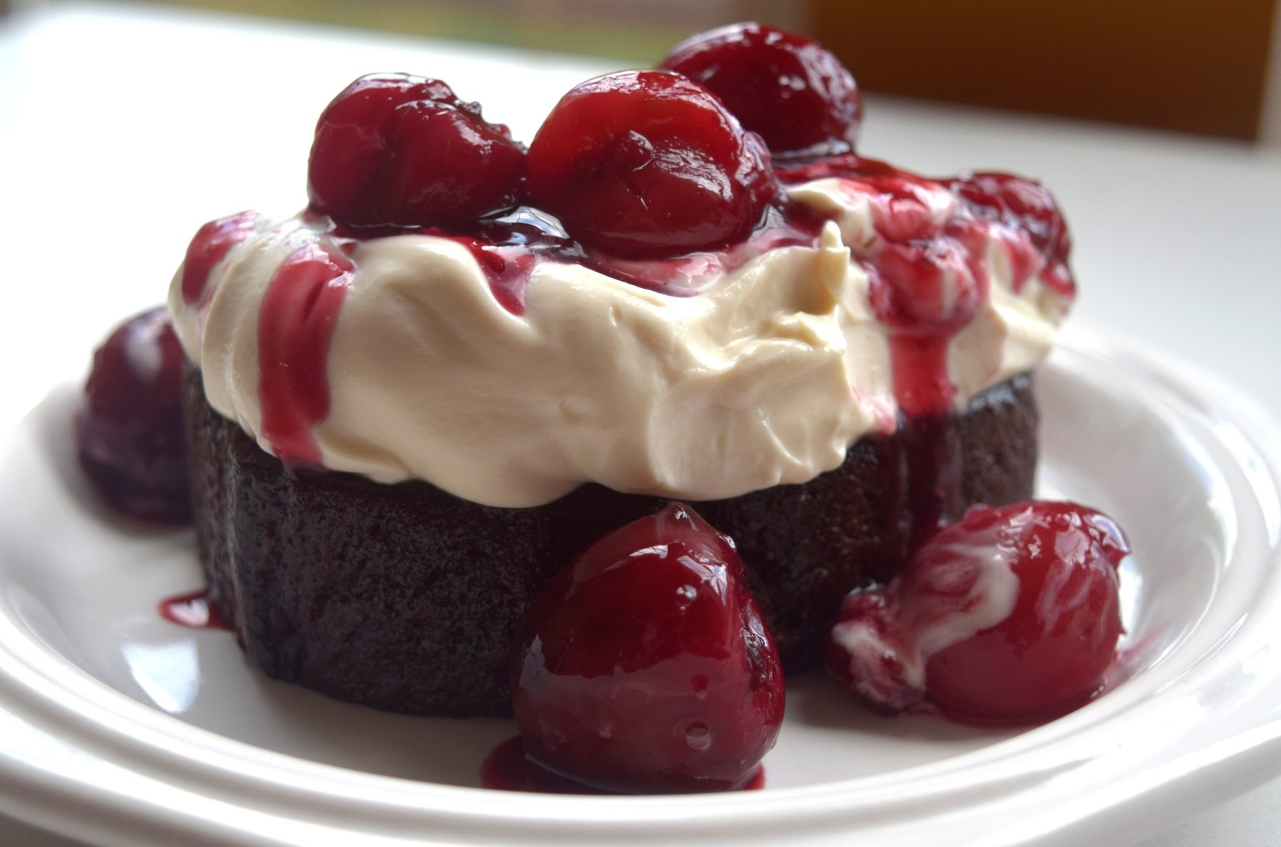 Peach Ale Cherries and Chocolate Stout Whipped Mascarpone on Chocolate Pound Cake
