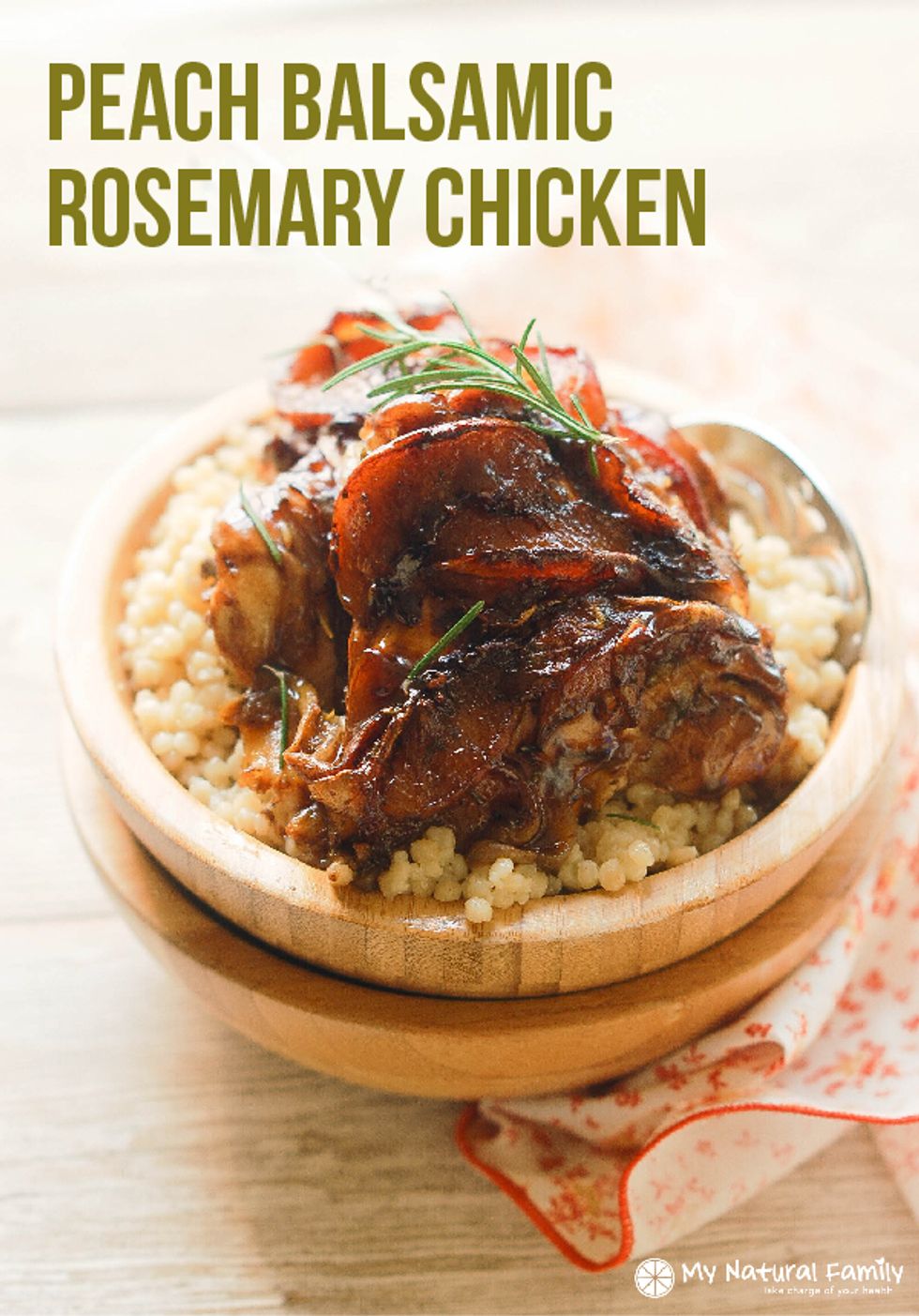 This chicken is so easy to put together and is such an elegant combo of flavors. Fresh summer peaches and rosemary pair so well with a rich balsamic reduction that coats the chicken thighs and results in a tender, glossy, flavorful dish.