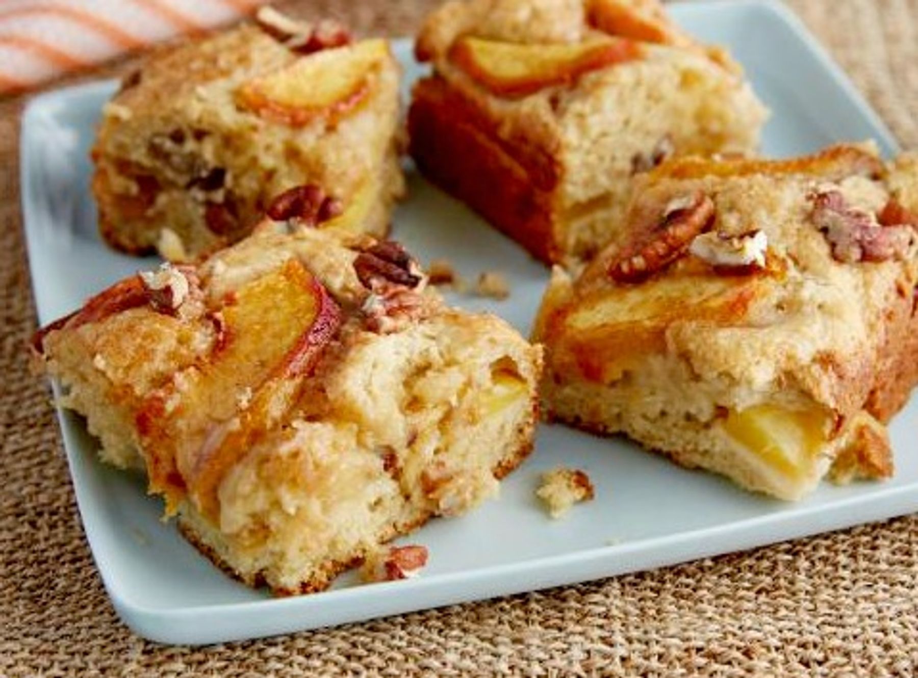 Then, Spread half of the batter evenly in the pan. Top with half of the peaches, then sprinkle with two-thirds of the sugar mixture. Spread the remaining batter on top, arrange the remaining peaches on top, and sprinkle with the remaining sugar mixture and the pecans.
