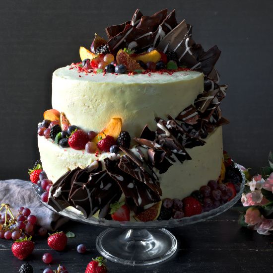 This cake with figs and peaches is a showstopper at any party! Peach layer cake with cream cheese frosting, decorated with homemade tempered chocolate shards, fresh and dry fruits. Looks amazing, and tastes great!
