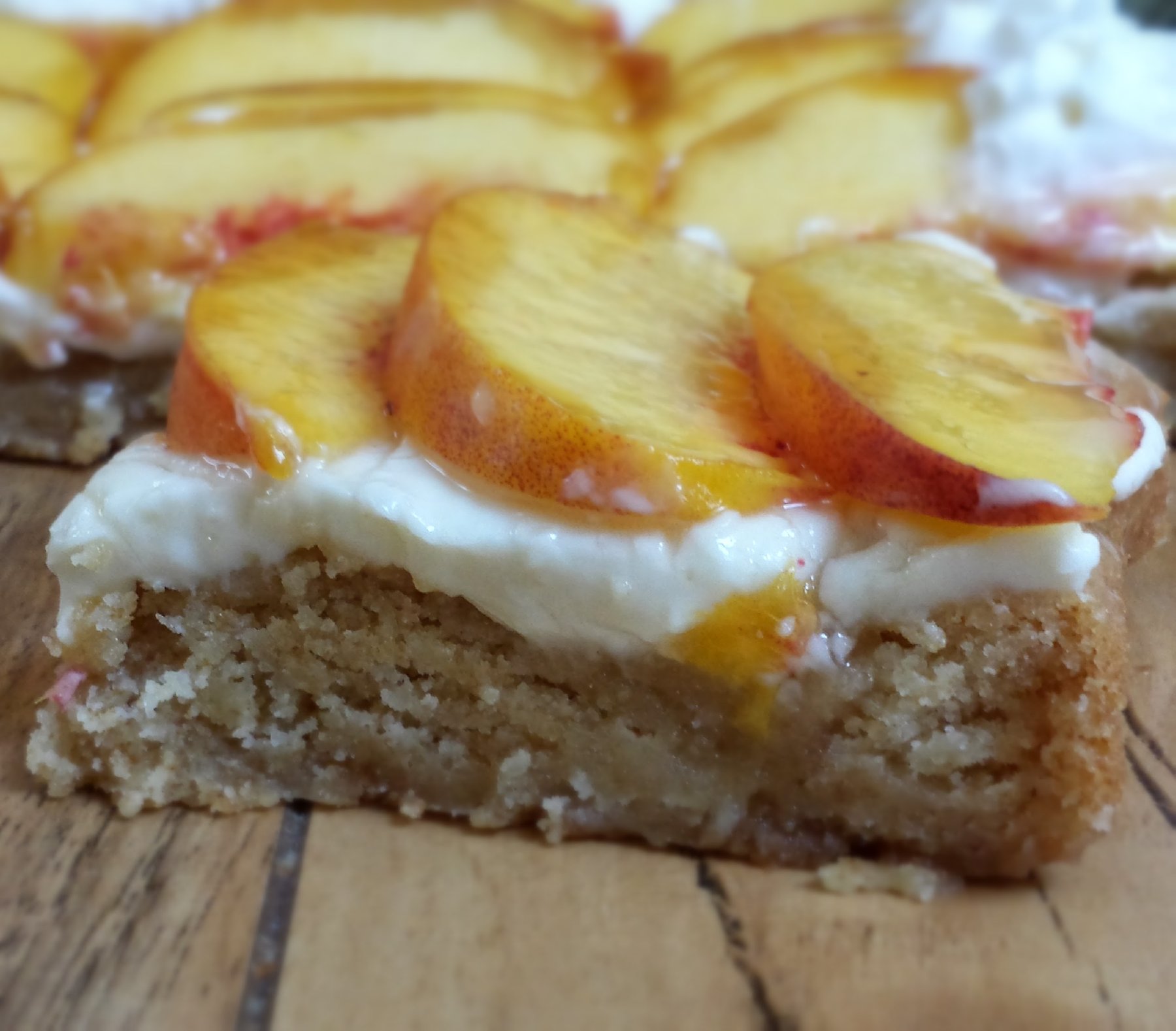 The sun is blazing, the dusty road is hot, the walk is long, and it is worth it because we know at the top there are sweet peach trees. Peach picking has become an annual family tradition that we enjoy right before the kids go back to school. Our kitchen becomes a peach festival as we eat, bake, cook, grill and create amazing dishes with the peaches we pick. This peach dessert has a sugar cookie crust on bottom, a cheesecake middle, and a fresh peach top that has a maple syrup drizzle. Adding fr