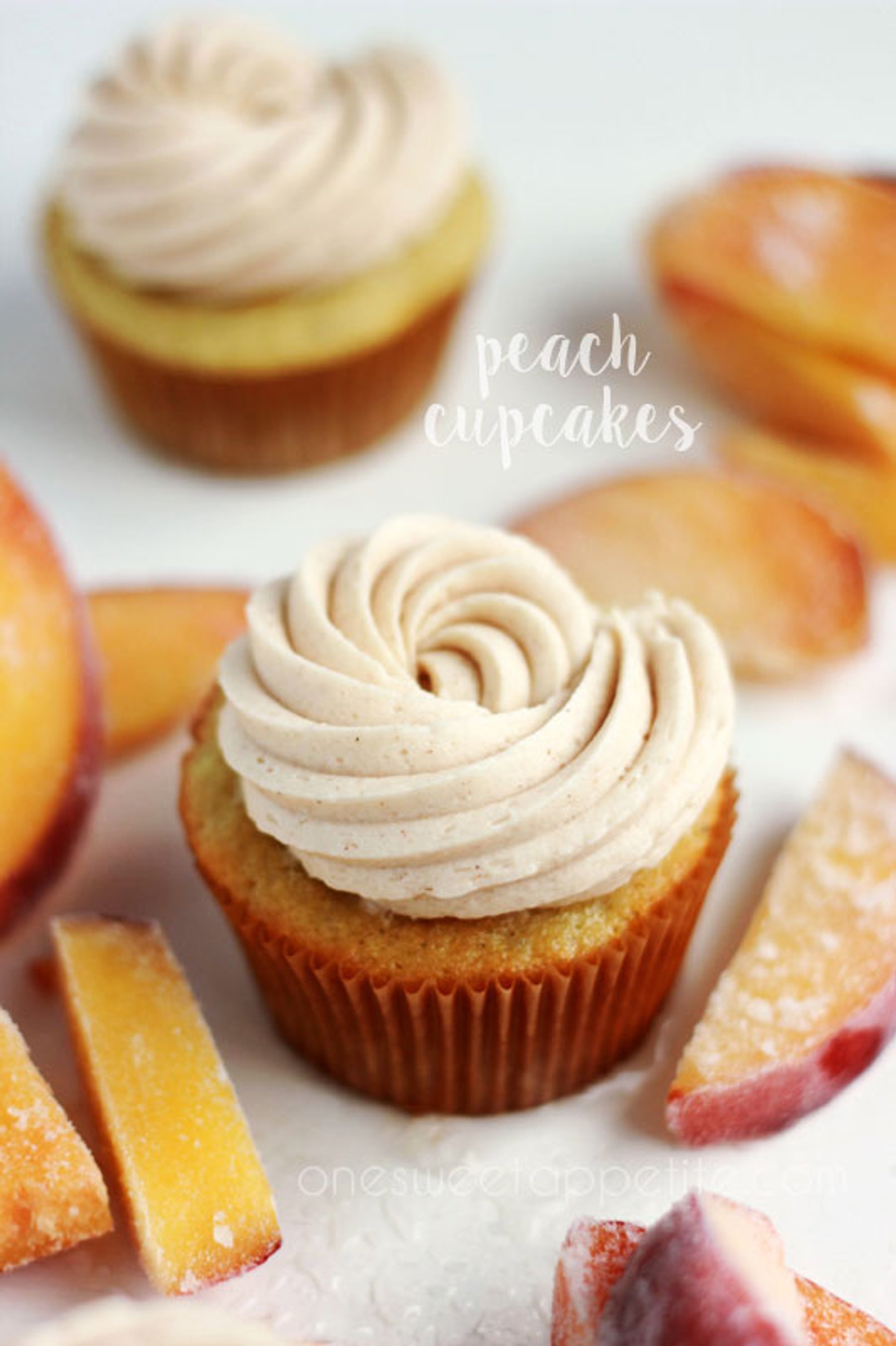 These peach cupcakes are filled with a peach puree and topped with a cinnamon frosting.