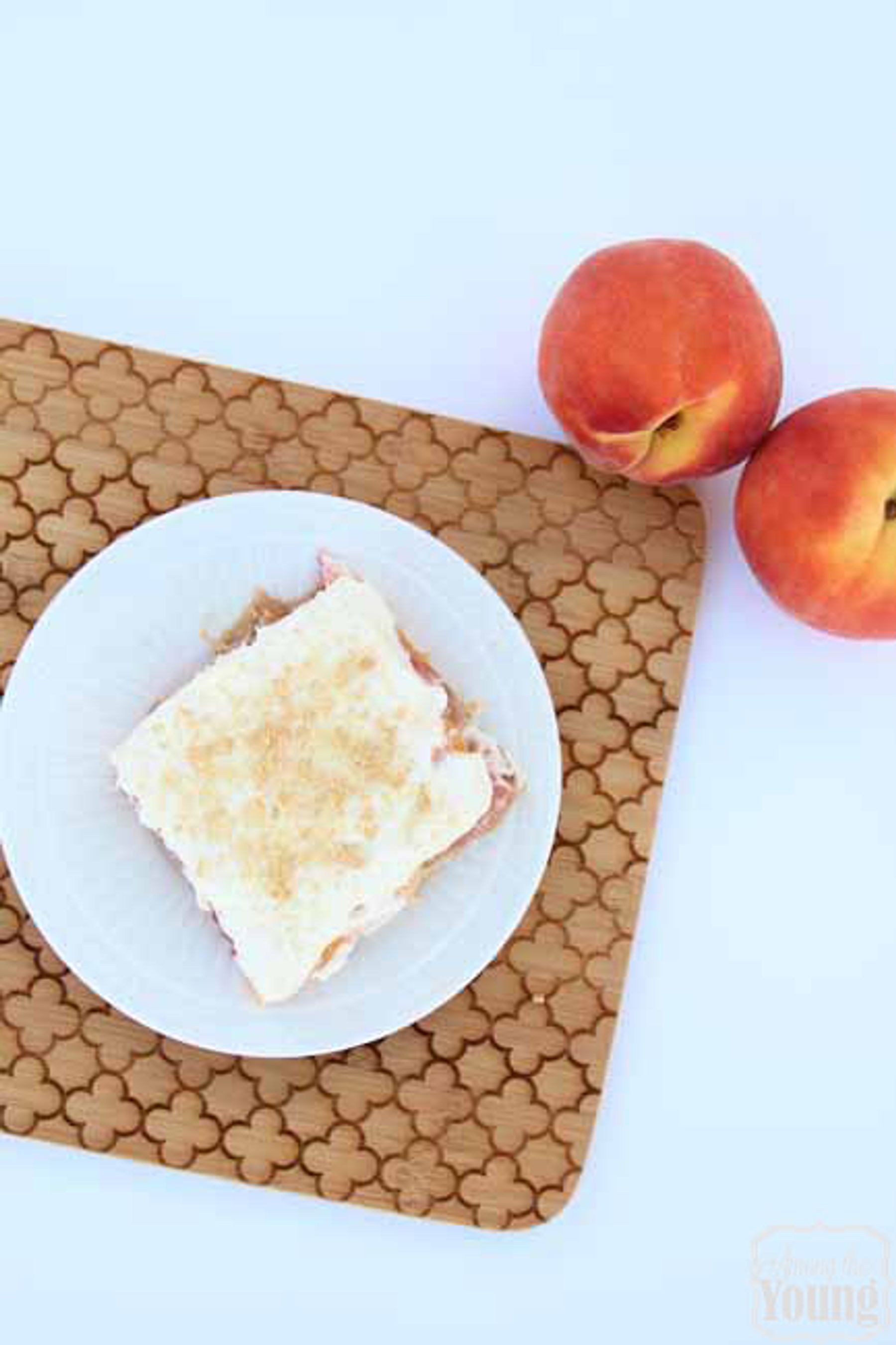 A graham cracker crust topped with peaches, jello, and whipped cream.