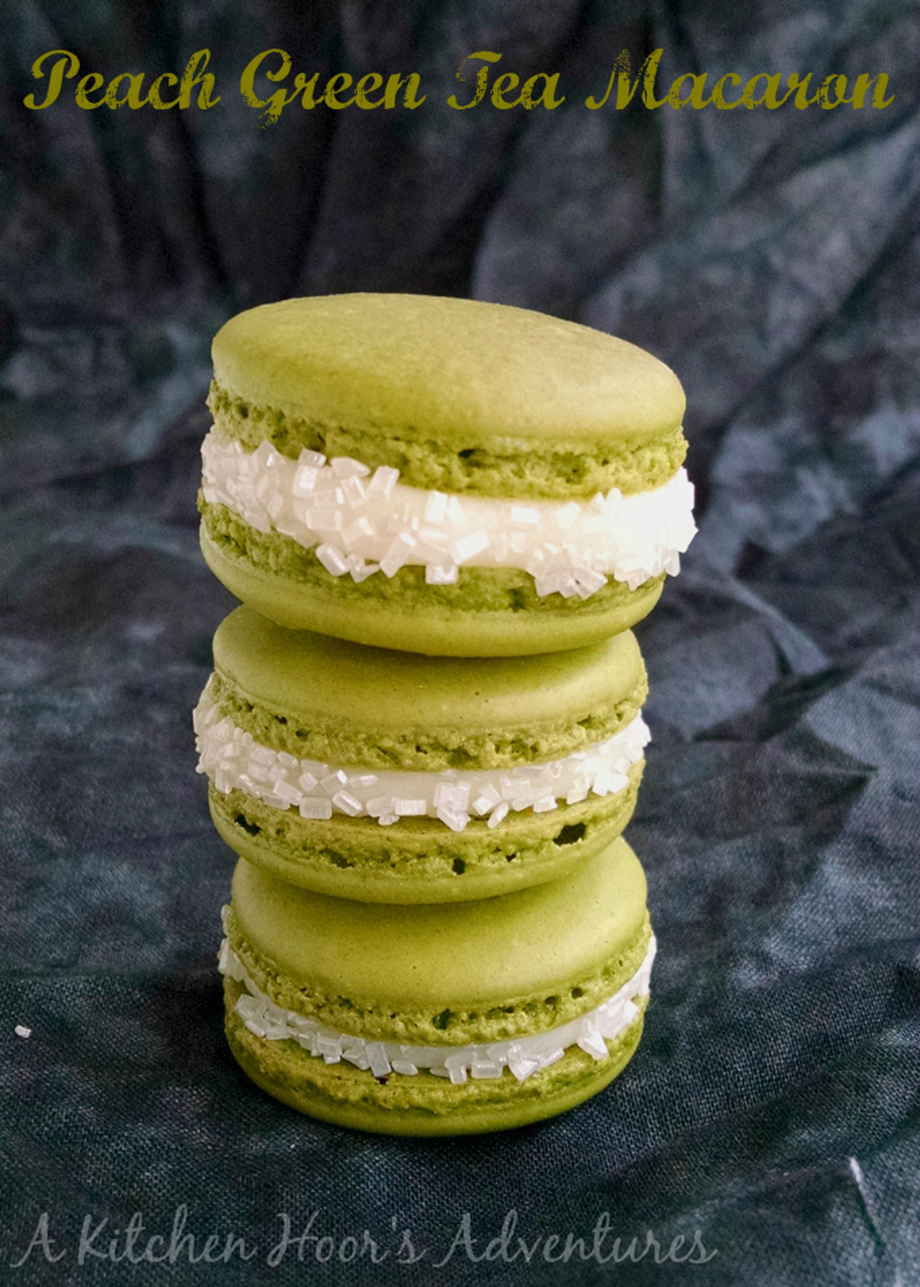 Matcha green tea powder is in the shells and peach flavored brandy is in the ganache. These Peach Green Tea Macaron are delicate and delicious.
